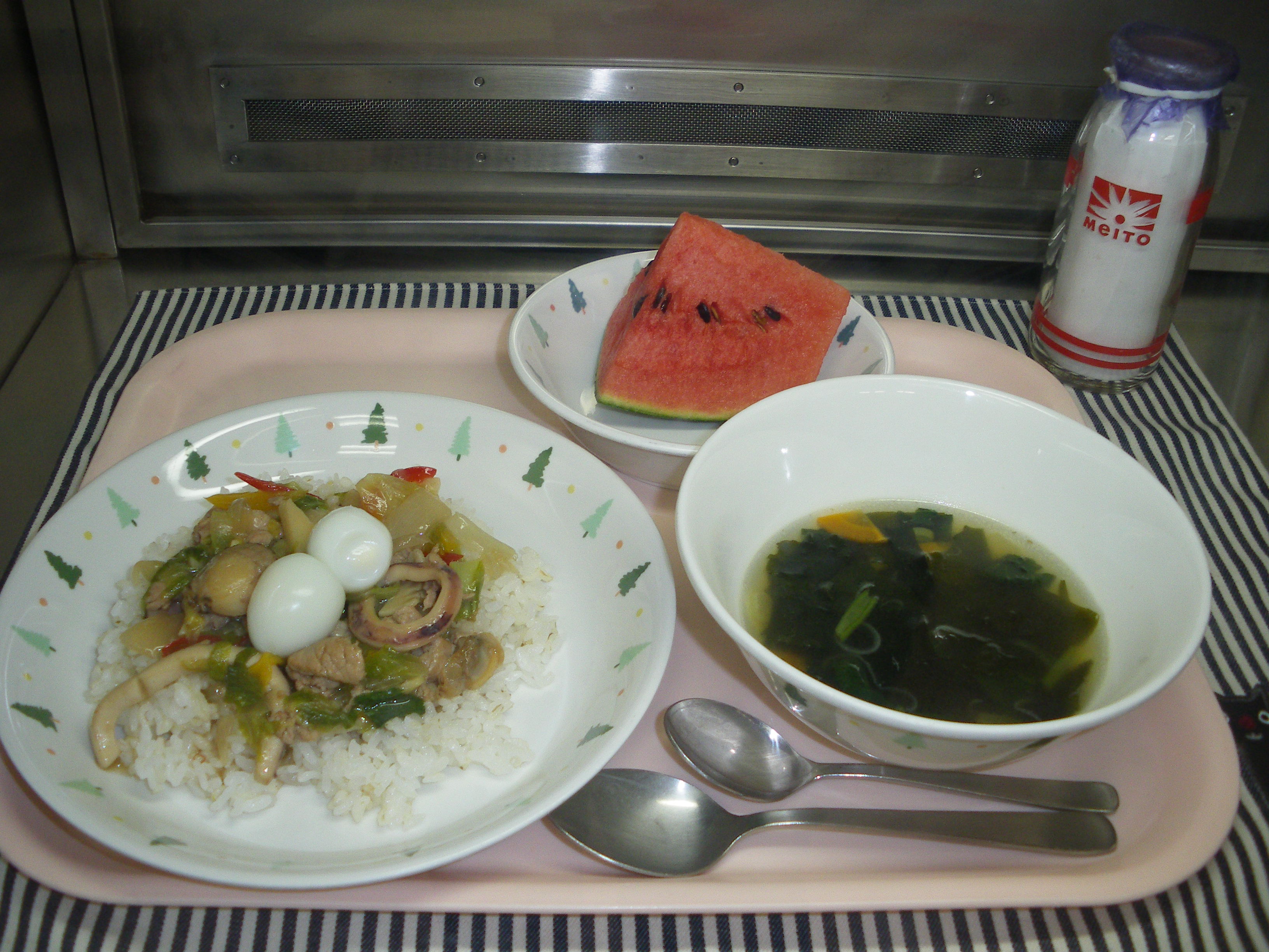 7月9日(月) 夏野菜の中華丼、小玉すいか