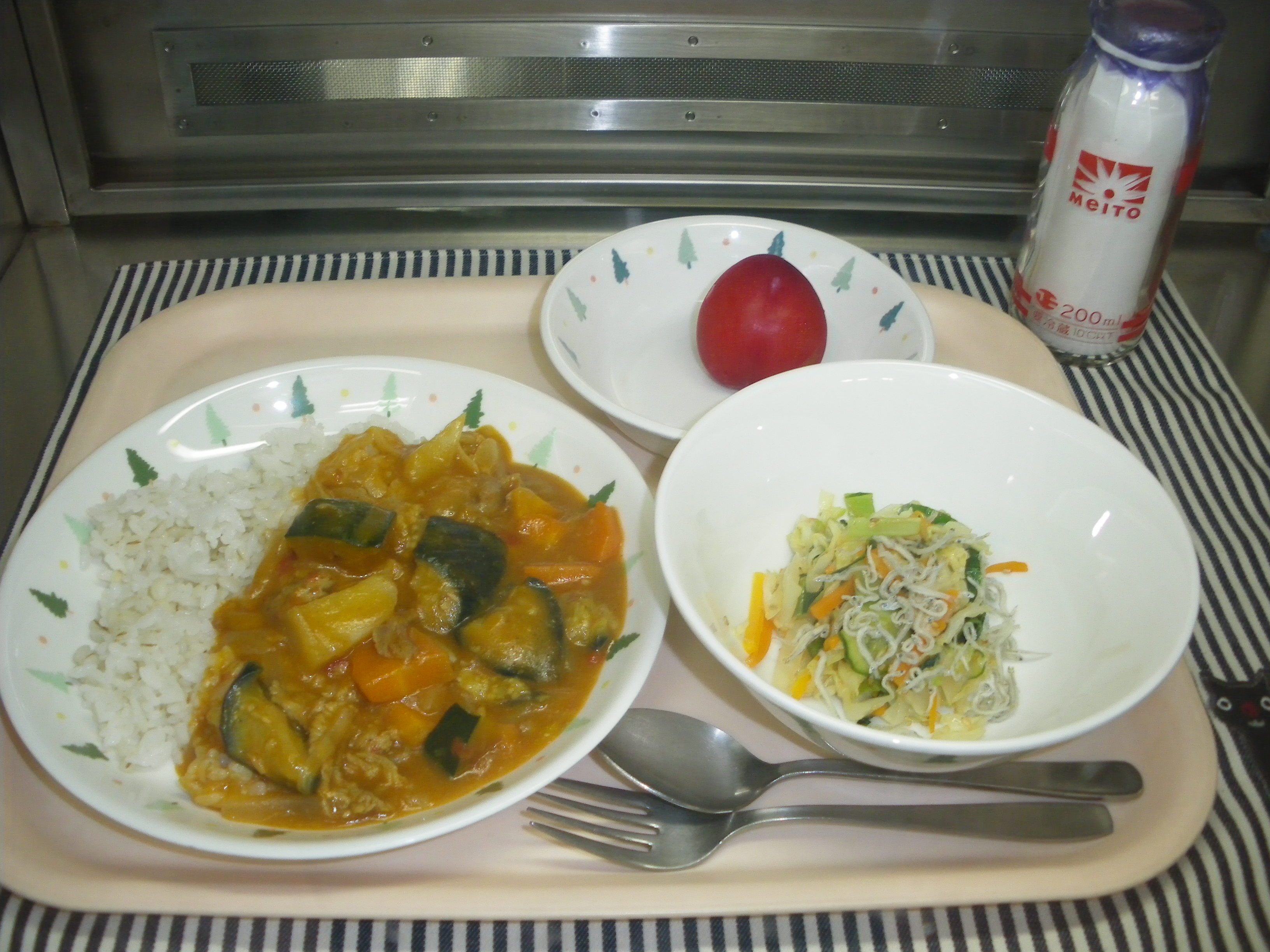 いつもより少しだけカレー粉を強めに入れて、夏向けの味付けに仕上げました。子供たちもよく食べていました。旬のプラムも甘くておいしかったです。