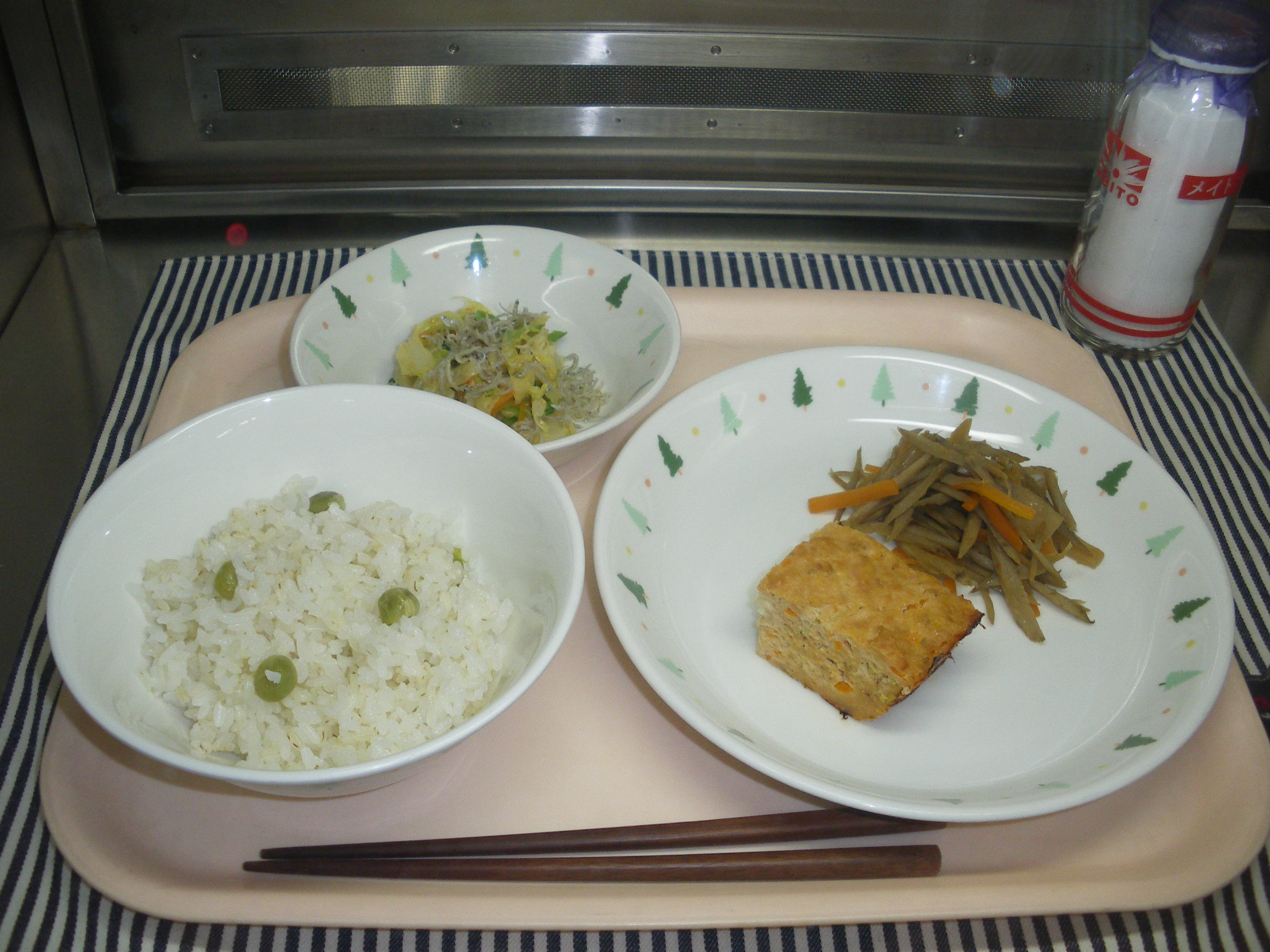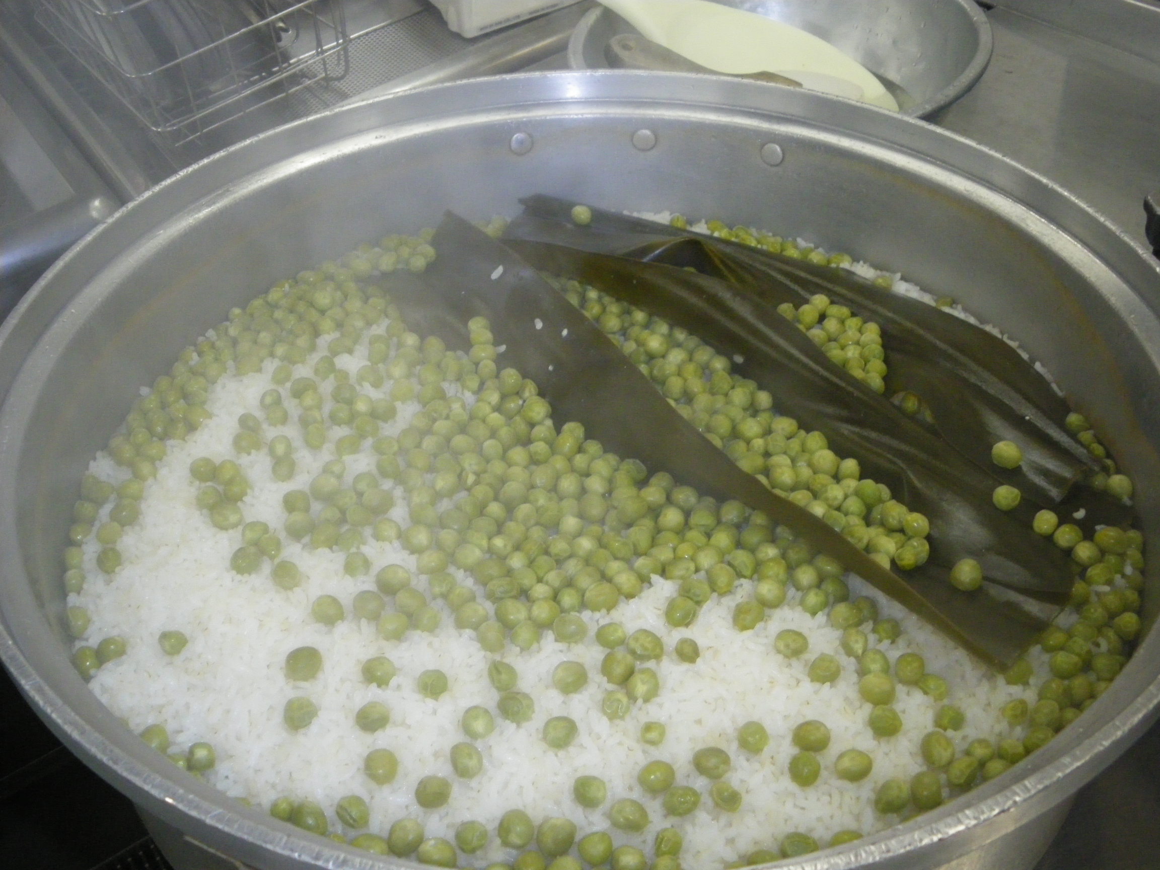 生のグリンピースを使いました。一緒に炊き込み、豆の甘さがほどよく感じられ、おいしく炊きあがりました。