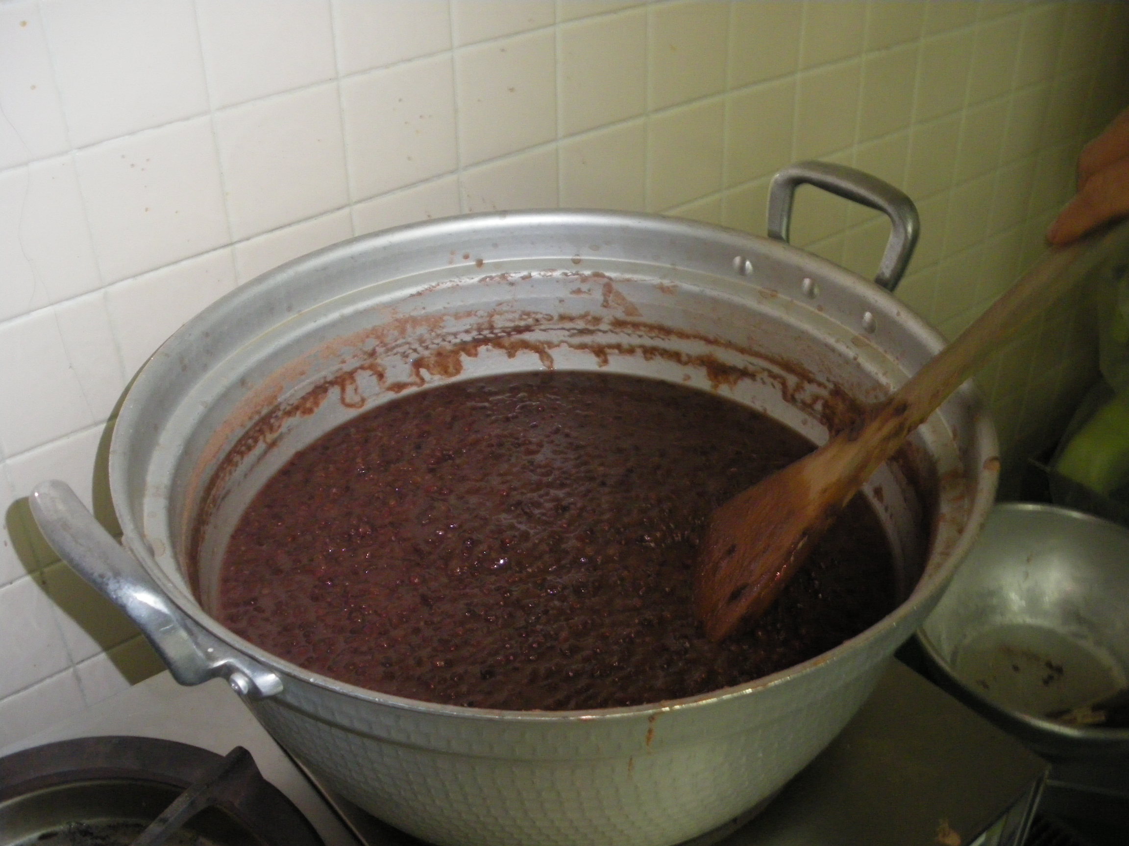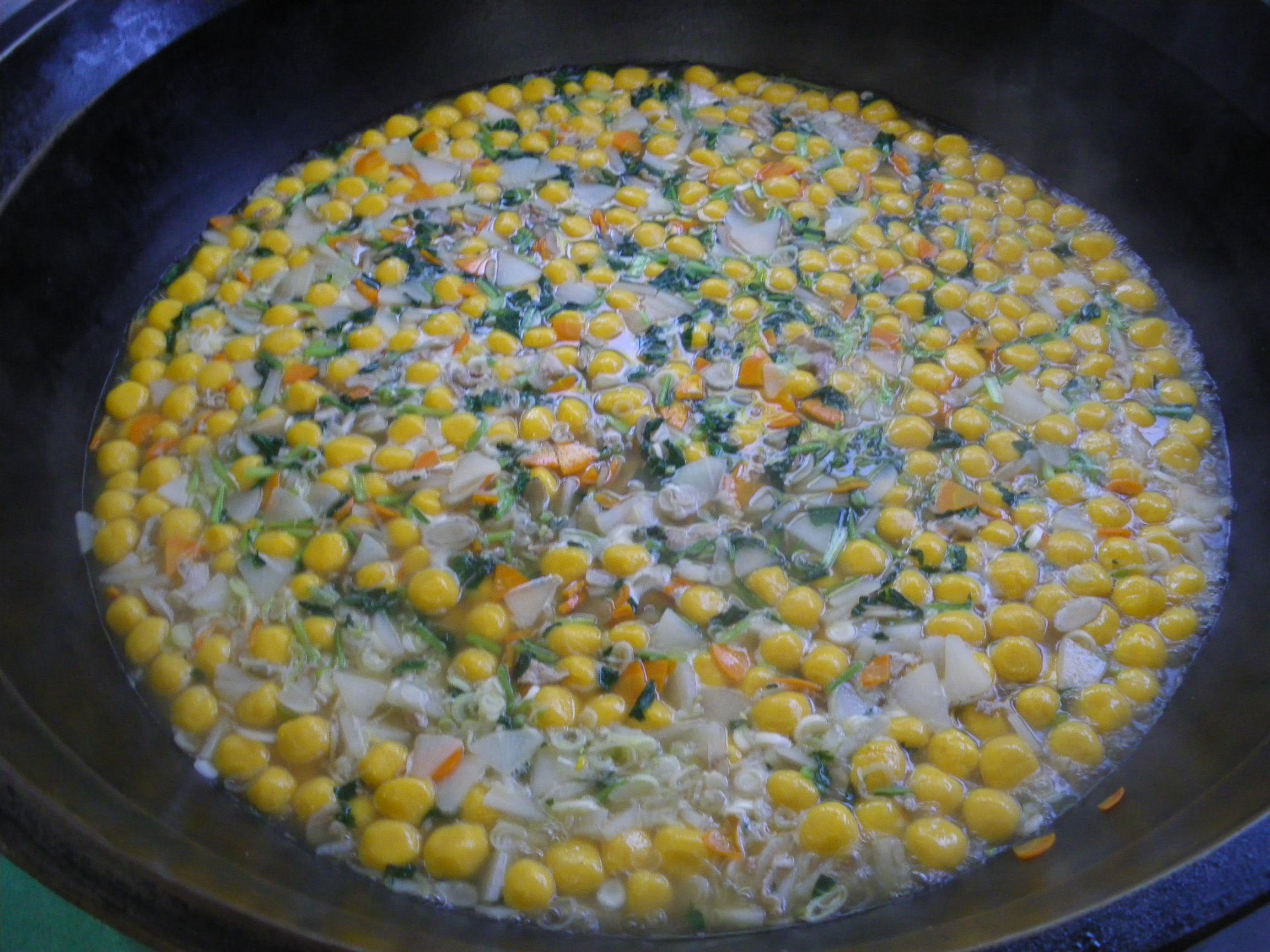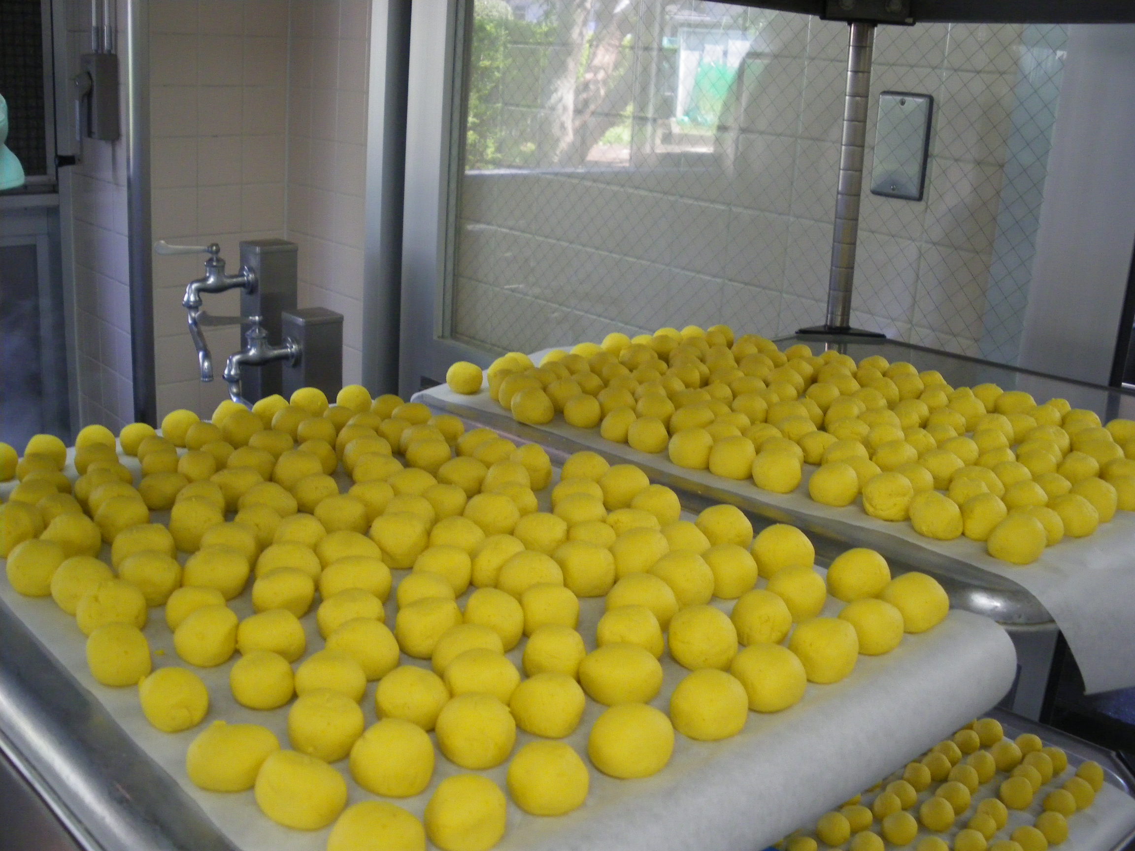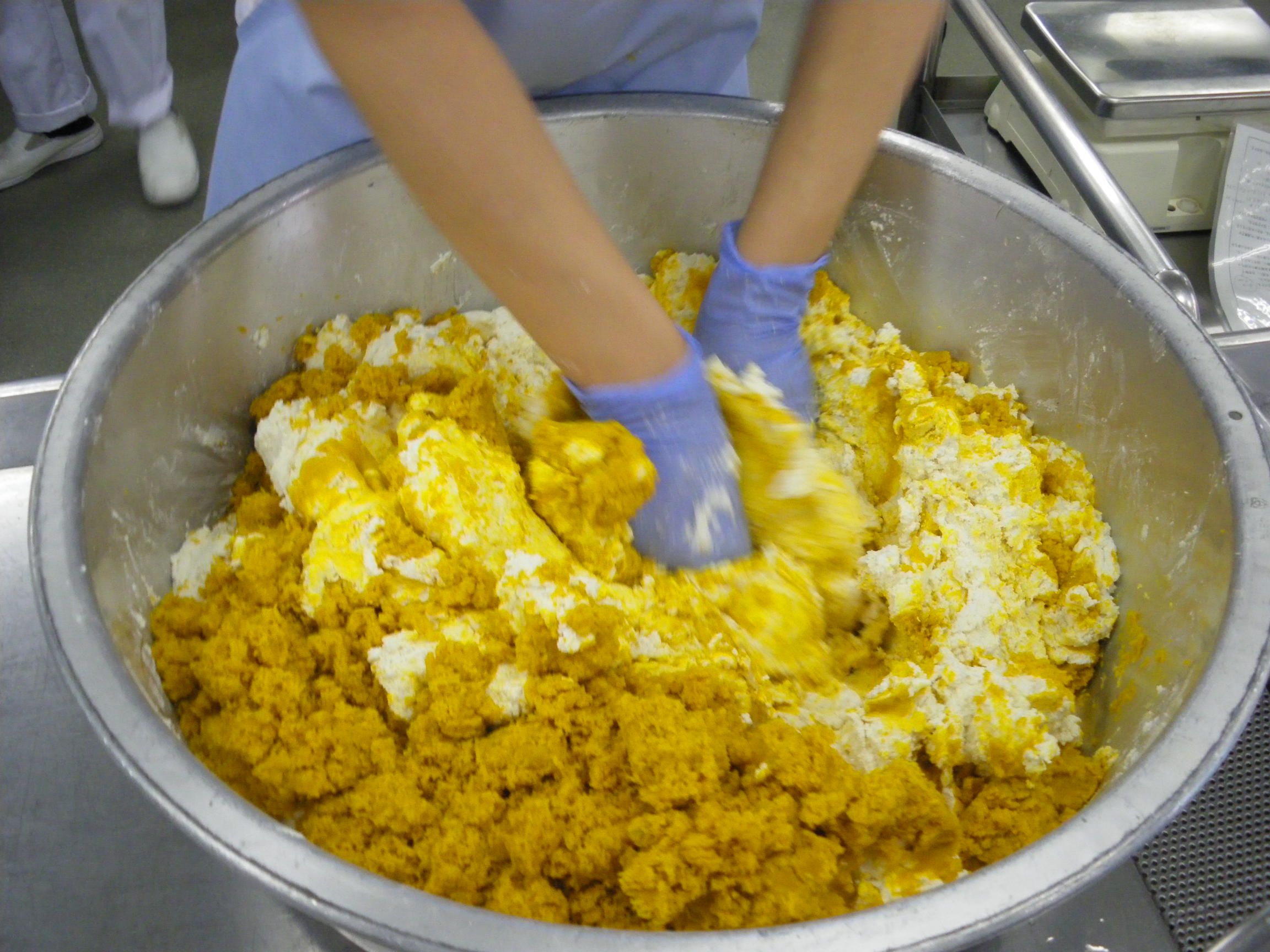 お月見団子の黄色はかぼちゃの黄色です。蒸した後に白玉粉と混ぜ団子にしました。