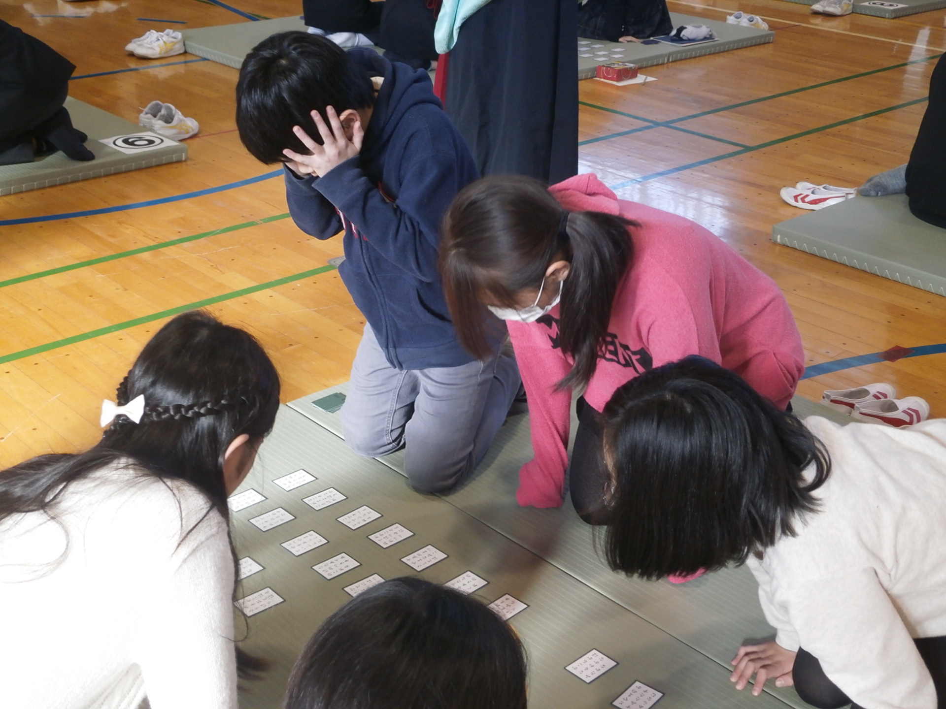 和泉中学校の2・3年生、和泉小学校と新泉小学校の6年生が一同に集まり、百人一首大会が開催されました。静まりかえり緊張感のある雰囲気の中、歌が詠まれると一斉に畳をたたく音があちこちで聞こえてきました。百人一首を通して和泉中と和泉小とのふれあいができました。