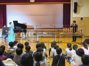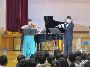 文化庁主催「学校における地域活性化のための文化芸術子供鑑賞・体験事業」として、3人組の音楽ユニット「ルロット・オーケストラ」が来校し、3.4年児童に演奏を聴かせてくださいました。ヴァイオリン・フルート・ピアノによる演奏のほか、手作りのアイリッシュハープの演奏、フライパンや塩ビの水道管などを楽器にしての楽しいパフォーマンスに、子供たちの目はキラキラ。「『森のくまさん』がすごくおしゃれになっていた」「『南の島のハメハメハ大王』が水道管の音で迫力が出てかっこよくなっていた」と、素敵な感想がたくさんありました。