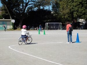 その後、実際の道路を想定した自転車の乗り方を練習しました。必ず左側から乗り降りすることや、右の後ろまで確認して発進することなど、大切なポイントを体験的に学ぶことができました。終了後、自転車運転免許という形で認定証を頂きました。これからも安全に気を付けて利用しましょう。