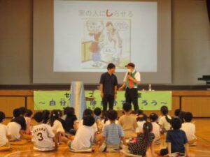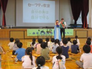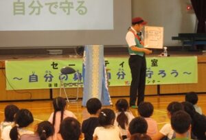 6月8日と14日、警視庁高井戸警察署少年課にご協力いただき、体育館にてセーフティ教室が行われました。1、2年は全国読売防犯協会にご協力いただき、ゲストティーチャーにお笑い芸人の武田貴行先生をお招きして、「自分の身は自分で守る」をテーマに危ない人や場所について、お話を聞きました。腹話術人形を通したお話に、子供たちはとても興味津々。一人一人が身を守るための方法をじっくりと学び、これからの行動についても深く考えることができました。