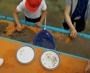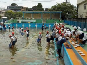 事前学習に杉並環境ネットワークの方々をお招きし、学校のプールの中にはヤゴ(トンボの赤ちゃん)が暮らしていることを知りました。しかし、そのヤゴは私たちのプールが始まる前の掃除によって流されてしまうことを知り、ヤゴの命を救うため、3年生でヤゴ救出大作戦を決行しました!最初は怖がりながら探していたヤゴにもすぐに慣れ、アカトンボやシオカラトンボ、ヤンマになるヤゴの種類を見分け、合計3231匹を救出しました。全てのヤゴがトンボに羽化する日を楽しみに、教室や各家庭で大切に育てています。