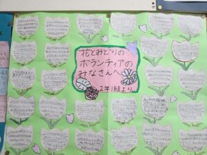 3月14日朝に「ありがとうの会」が開かれました。1年間お世話になった様々なボランティアの代表の方にご来校いただき、子どもたちの感謝を込めた寄せ書きをお渡ししました。その様子は各教室に生配信されていて、会の終わりには全校児童から感謝の拍手をお贈りしました。