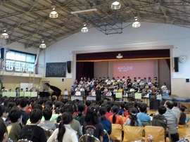 1年生は国語科の「くじらぐも」に合わせて言葉や演技を入れながら、「さんぽ」「風になる」「となりのトトロ」のジブリ作品の歌と合奏を元気いっぱいに表現しました。