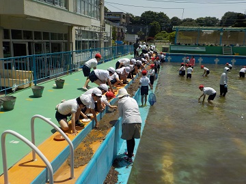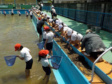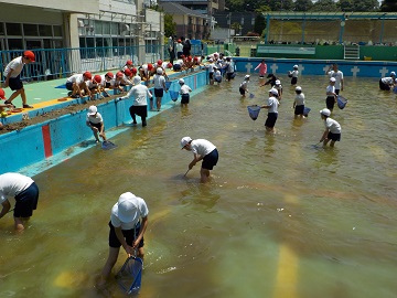 3年 ヤゴ救出大作戦 杉並環境ネットワークの方々をお招きし、学校のプールの中にはヤゴ(トンボの赤ちゃん)が暮らしていることを事前学習から知りました。しかし、そのヤゴは私たちのプールが始まる前の掃除によって流されてしまうことを知り、ヤゴの命を救うため、3年生でヤゴ救出大作戦を決行しました。最初は怖がりながら探していたヤゴにもすぐに慣れ、アカトンボやシオカラトンボ、ヤンマになるヤゴの種類を見分け、合計1639匹を救出 しました。全てのヤゴがトンボに羽化する日を楽しみに、教室や各家庭で大切に育てています。