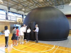 6年 プラネタリウムの出前授業 2024.11.06 済美教育センターの方々が来校し、理科の「月と太陽」の出前授業がありました。体育館に設置されたドームの中に入り、様々な時間帯に見られる月の形や位置を学習しました。ドームで空を再現してもらったことで実際に調べることが難しい、「月と太陽の関係」を視覚的に学ぶことができました。月の形が変化していく様子に子どもたちからは歓声が上がっていました。