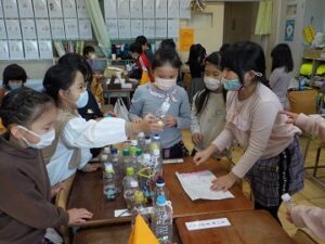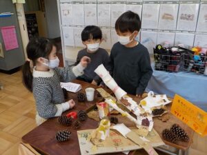 集めてきた「秋の宝物」でたくさん遊んだあとに、楽しかった遊びのお店を開きました。隣のクラスの友達が遊びにきてくれました。写真は「マラカス屋さん」(左)と「ジェットコースター」(右)です。友達に、見付けた遊び方を教えてあげたり、一緒に遊んだりして、とても楽しい時間になりました。
