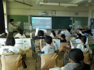4年 「出前授業」 2022.04.01 2022.03.22 3月4日(金)に神田川環状7号線地下調節池の職員の方をお招きして、社会の「水害からくらしを守る」の学習を行いました。雨が降った時の調節池の動きを模型で見たり、中の様子を360度カメラで見たりしました。調節池の中を見た子供たちは「大きい!」「こんなにたくさん水が入るの?」と驚いていました。実際に働いている方の話を聞いたことで、自分たちで調べたことがより深まり、防災への意識も高まりました。