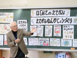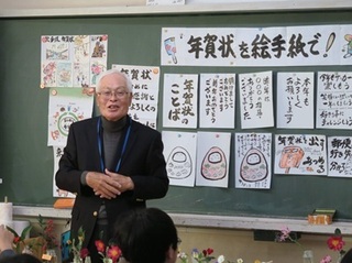 講師は絵手紙マイスターの石井繁雄先生5年生は 1年生で絵手紙の基礎、2年生で年賀状、3.4年生で暑中見舞いを経験し、5回目の絵手紙教室顔なじみの石井先生と元気な挨拶からスタート今回は、割り箸を削った箸ペンを使って絵手紙年賀状を作成しますまず年賀状の豆知識から☆年賀状の始まりは〜 平安時代から 今のお年玉くじ付き年賀はがきは昭和24年(76年前)から 来年のお年玉くじ1等賞品は現金30万円☆十二支ってなあに? 年賀状によく描かれている動物たちを十二支といいます 十二支はもともと..