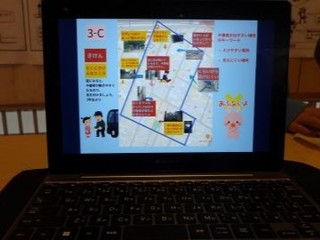 2学期にスタートした地域安全マップ作り。インストラクターの中尾清香先生から犯罪の危険について、不審者は見抜けなくても不審者が好む場所や景色は、キーワード「入りやすくて見えにくい」を使って見抜けるよ、というお話を聞き、その後キーワードに当てはまる場所を探すフィールドワークをしました。そして3学期、歩いて調べた結果を白地図に落とし込み、ついに地域安全マップを完成させました。班ごとにパワーポイントを使って説明資料を作り、学校公開日に他の児童や保護者の方々に自分の班で作ったマップにつ..