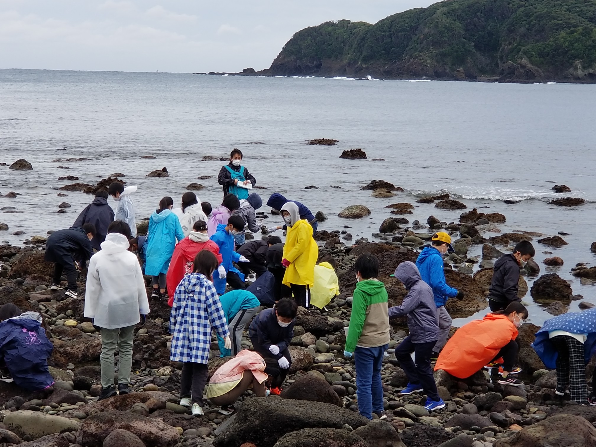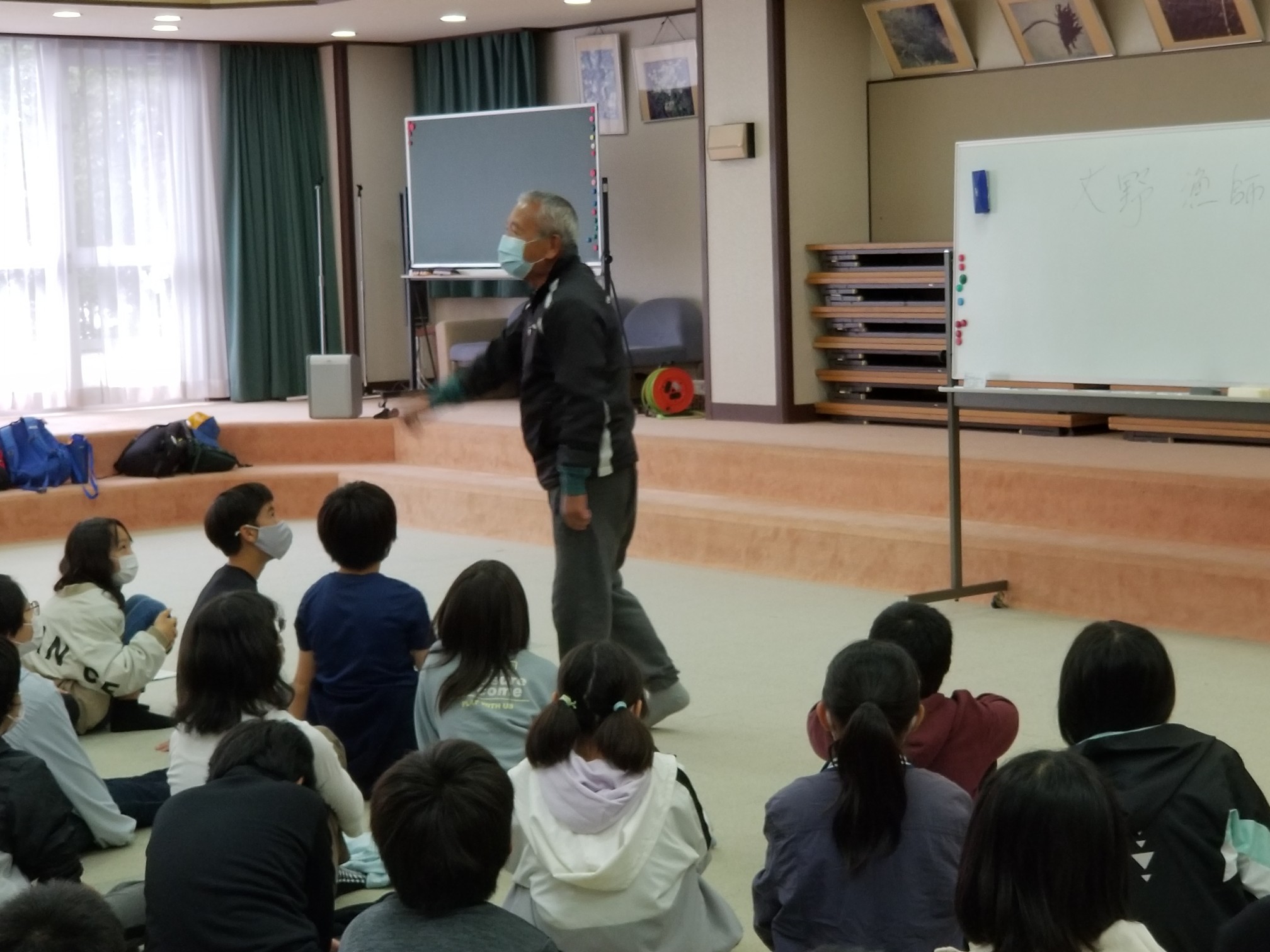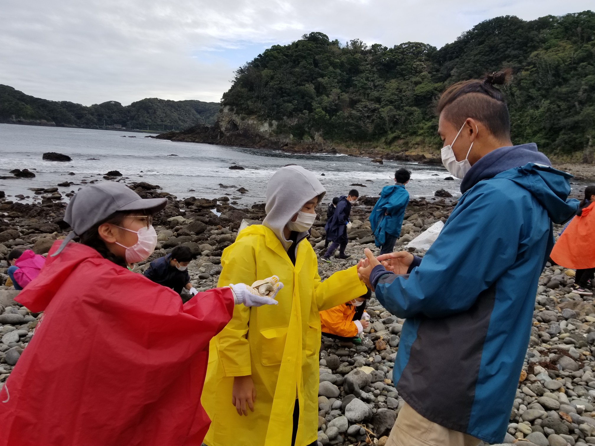 8時45分 雨が降っていて磯観察はできそうにありません。 でも、ネイチャガイドの堀直也さんが来てくださり、海の生き物のレクチャーをしてくださっています。すごくすごく楽しい授業! 『10000分の1の奇跡のカニ』・・・この言葉の意味を学びました。