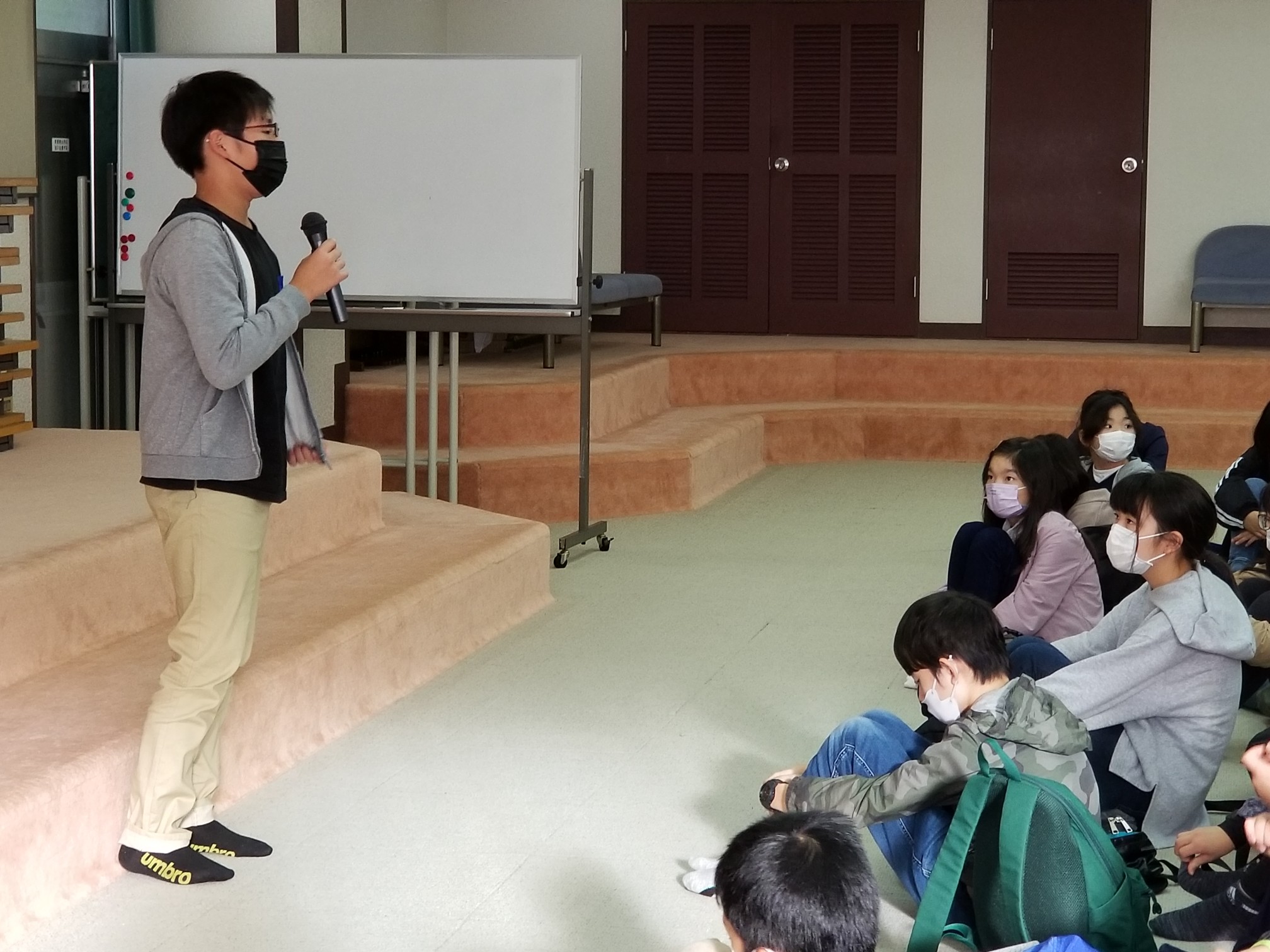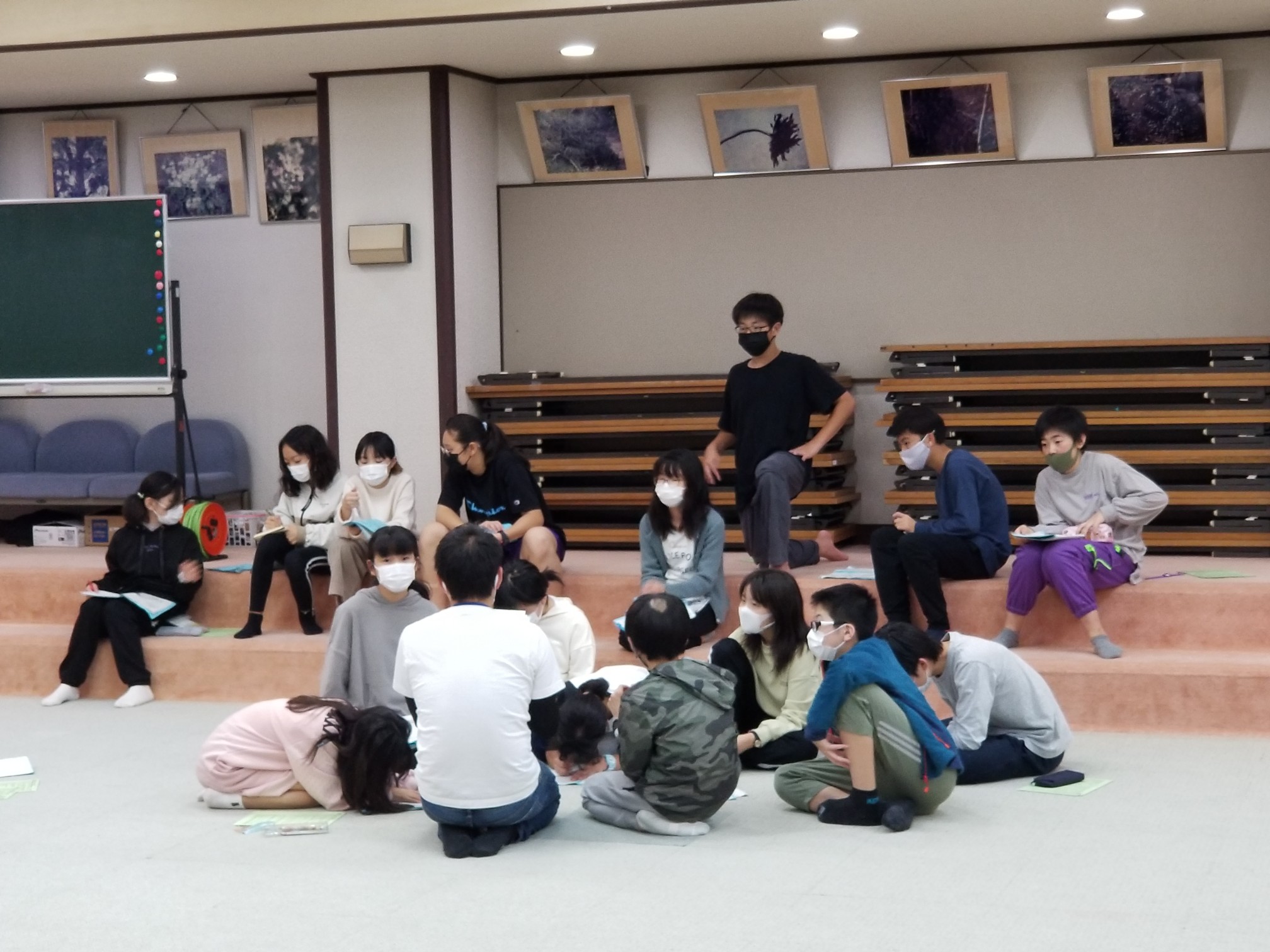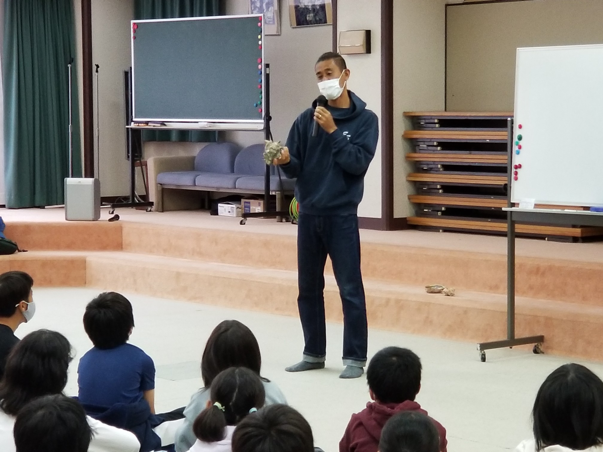 8時45分 雨が降っていて磯観察はできそうにありません。 でも、ネイチャガイドの堀直也さんが来てくださり、海の生き物のレクチャーをしてくださっています。すごくすごく楽しい授業! 『10000分の1の奇跡のカニ』・・・この言葉の意味を学びました。