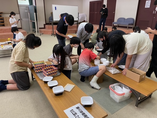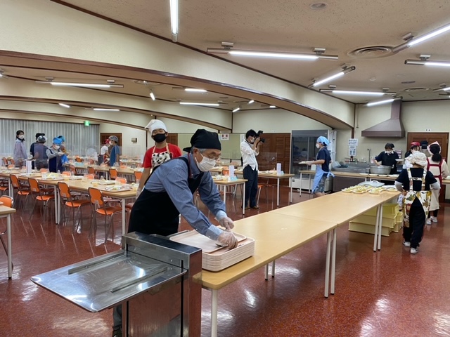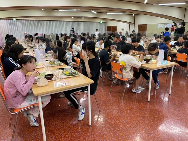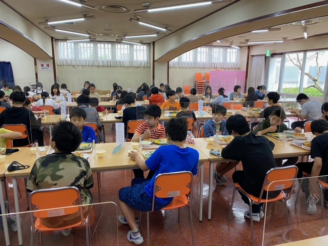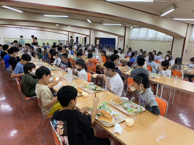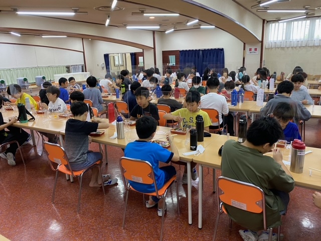 砂浜に行ったため、夕食の時間は30分繰り下げました。水筒の飲み物がなくなってしまっていた子も多く、水もたくさんおかわりしていました。