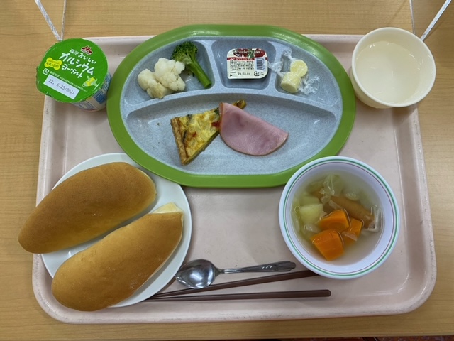 朝食は、パンとキッシュ、ハム、チーズ、スープです。食べ終わった後は、部屋の片付け等が心配なところから部屋に戻りました。