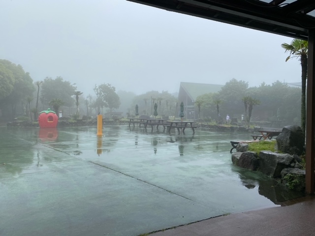 3日目のメインの場所、シャボテン公園です。ガスがかかっていて、視界は悪く、気温も低いです。11:00開店のお店で、ソフトクリームを食べました。味は、シャボテン、ミルク、ミックスの三つから選びました。その後、直ぐにお弁当を食べました。30分程度時間が押しています。