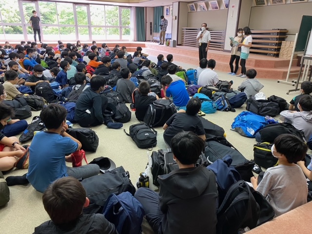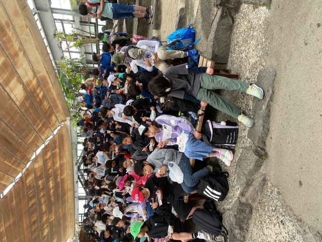 一番最初に来たグループの班長が、靴のかかとをそろえて並べるように声をかけていました。集団で生活するよい姿が見られました。