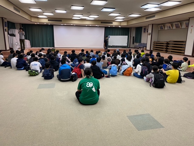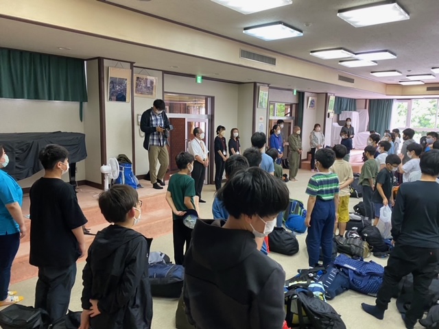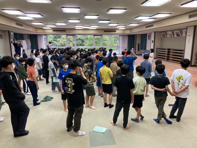 昨晩、星空観察から戻った8:40頃から、音を立てて雨が降り出しました。2日目は朝から雨模様です。朝会はレクルームで行いました。