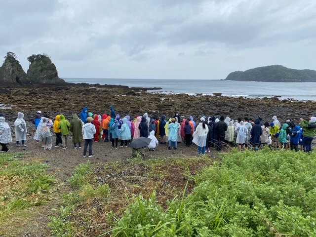 弱い雨は降っていましたが、潮が大変引いていて、風の影響もあまりないことから、みんな雨の装備をして、磯観察に出かけました。