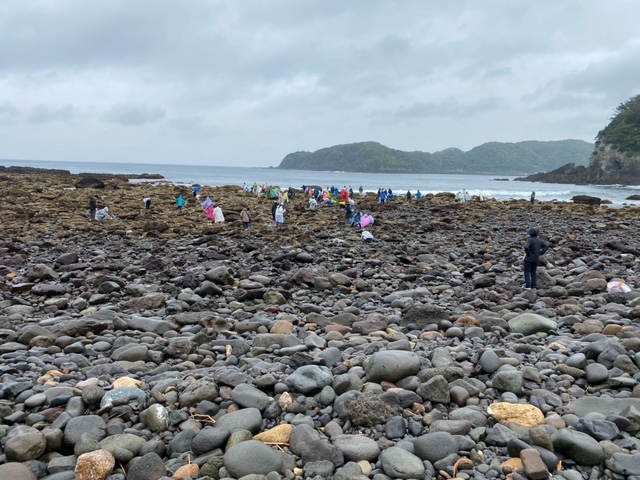 以前に事故で亡くなった方に向けて、みんなで黙祷を捧げた後に磯観察を始めました。カニやエビなど様々な生き物を見付けたり、貝殻を拾ったりしていました。
