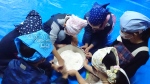 手でこねた後、足で踏むんです。一人20回、6人で120回。こうすることで、おいしいほうとうになるそうです。