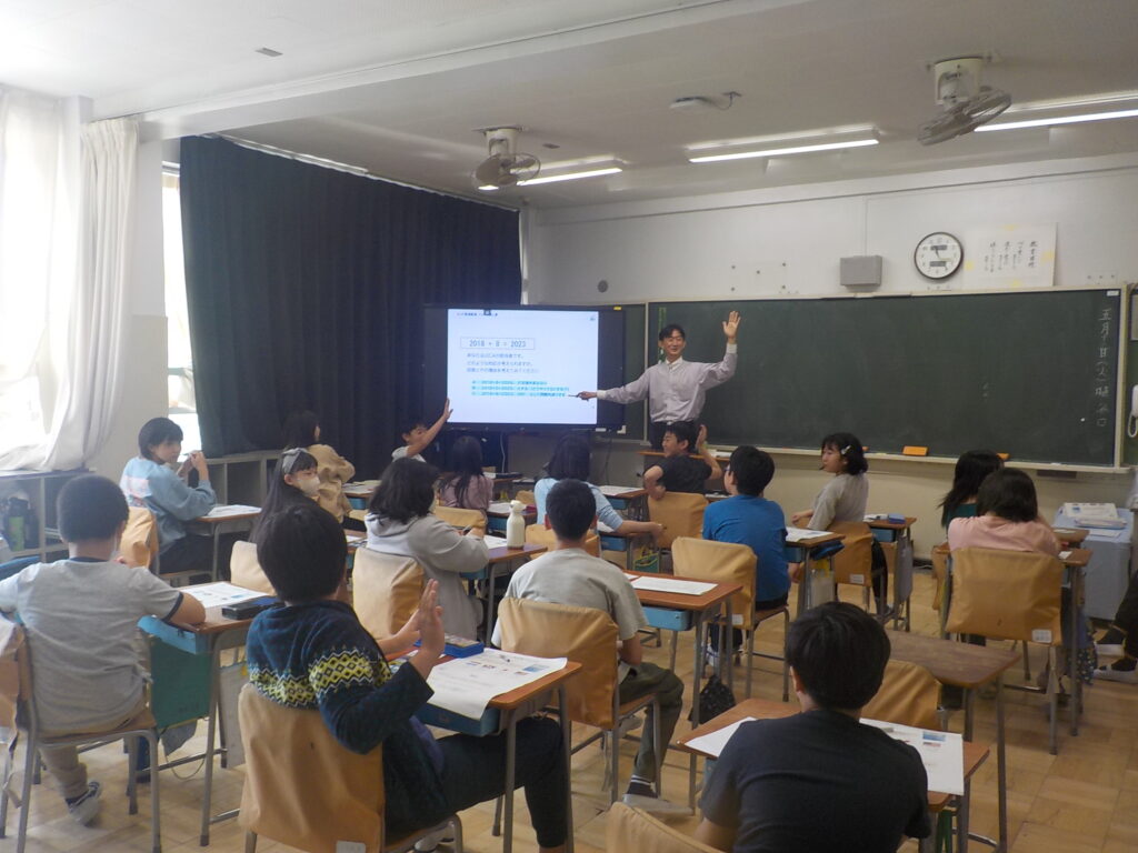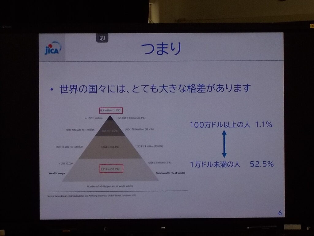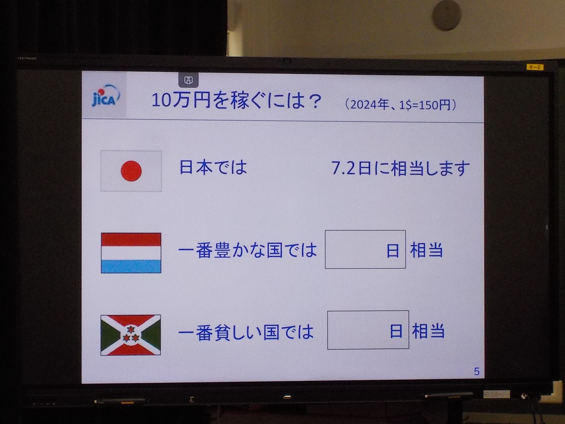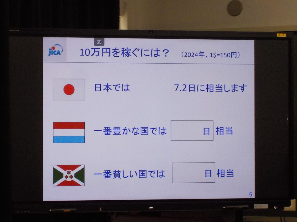 JICAのお話(総合的な学習の時間) 2025年5月20日 最終更新日時 : 2025年5月20日 中山 5月13日火曜日にJICA職員の小泉先生をお招きして、世界の様々な課題についてやJICAの活動などの話をスライドを使って説明していただきました。実体験の話やクイズ形式で質問をしていただいたので、子供たちは食い入るように聞き、質問されるとじっくりと考え、自分の意見を伝えていました。