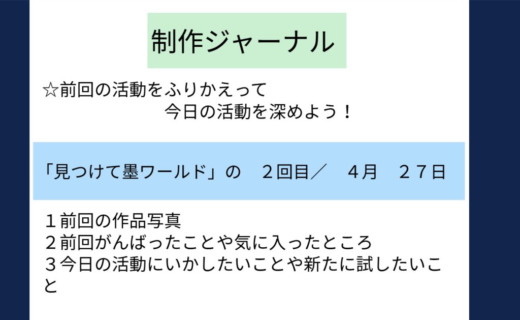 この題材では、主体的に学習を積み重ねられるように、タブレットを活用し、前回の振り返りと自分自身のめあての設定してから、制作に入るようにしています。