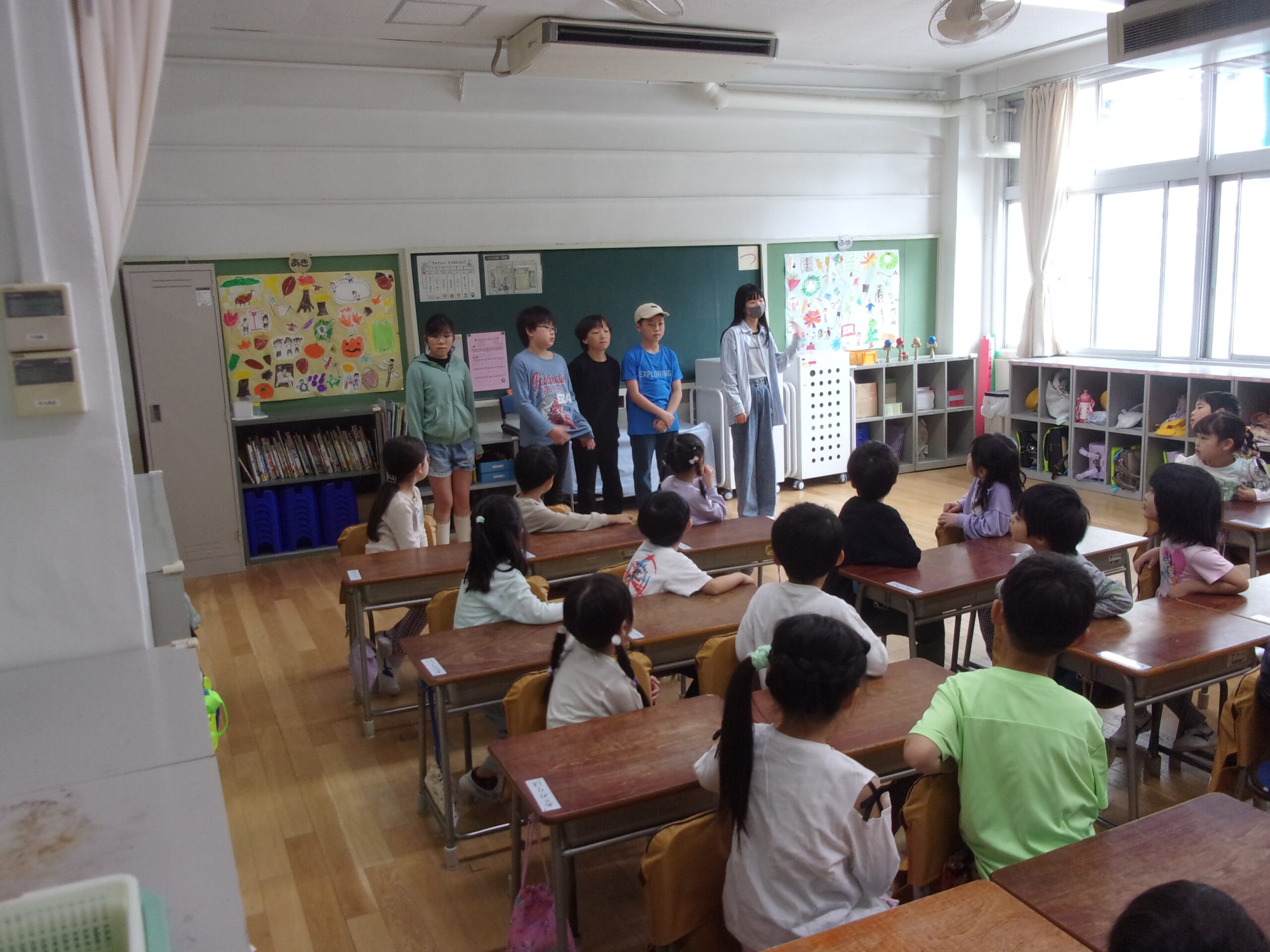 朝の時間、6年生が1年生の支度のサポートしたり、一緒に遊んだりしています。