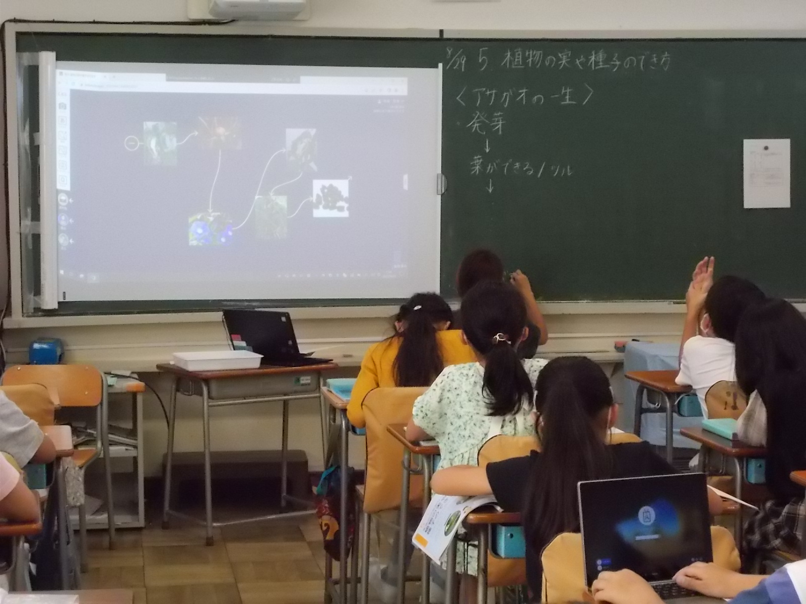 1年生は、一人一鉢のアサガオを種から育てています。子供たちは毎日一生懸命水やりなどのお世話をしたり、アサガオの成長の様子を記録したりしています。