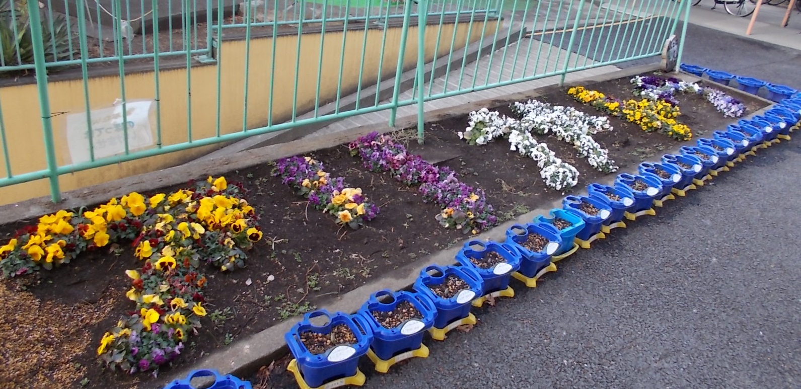 また、学校正門近くの花壇には、色とりどりのパンジーが咲いています。