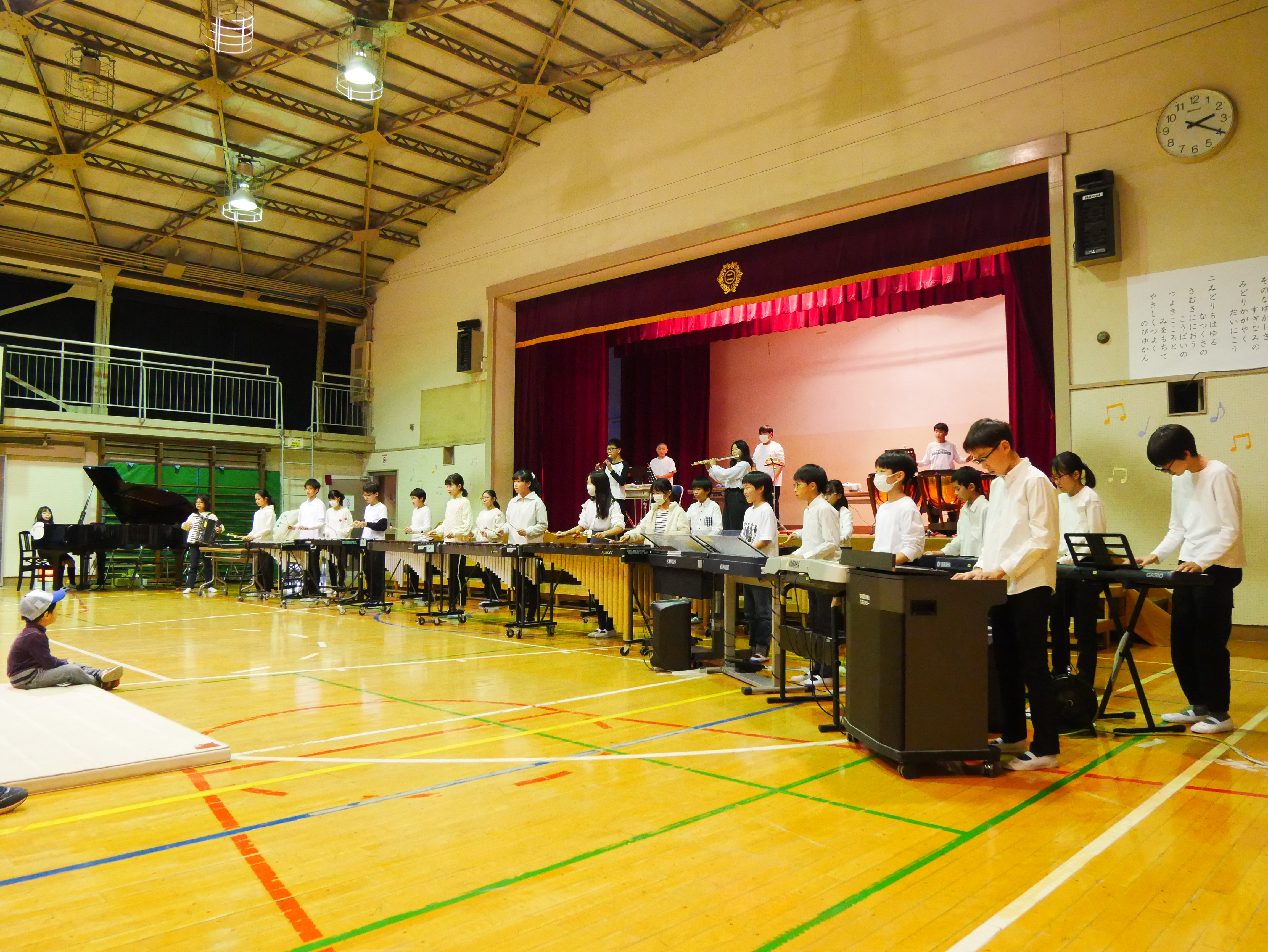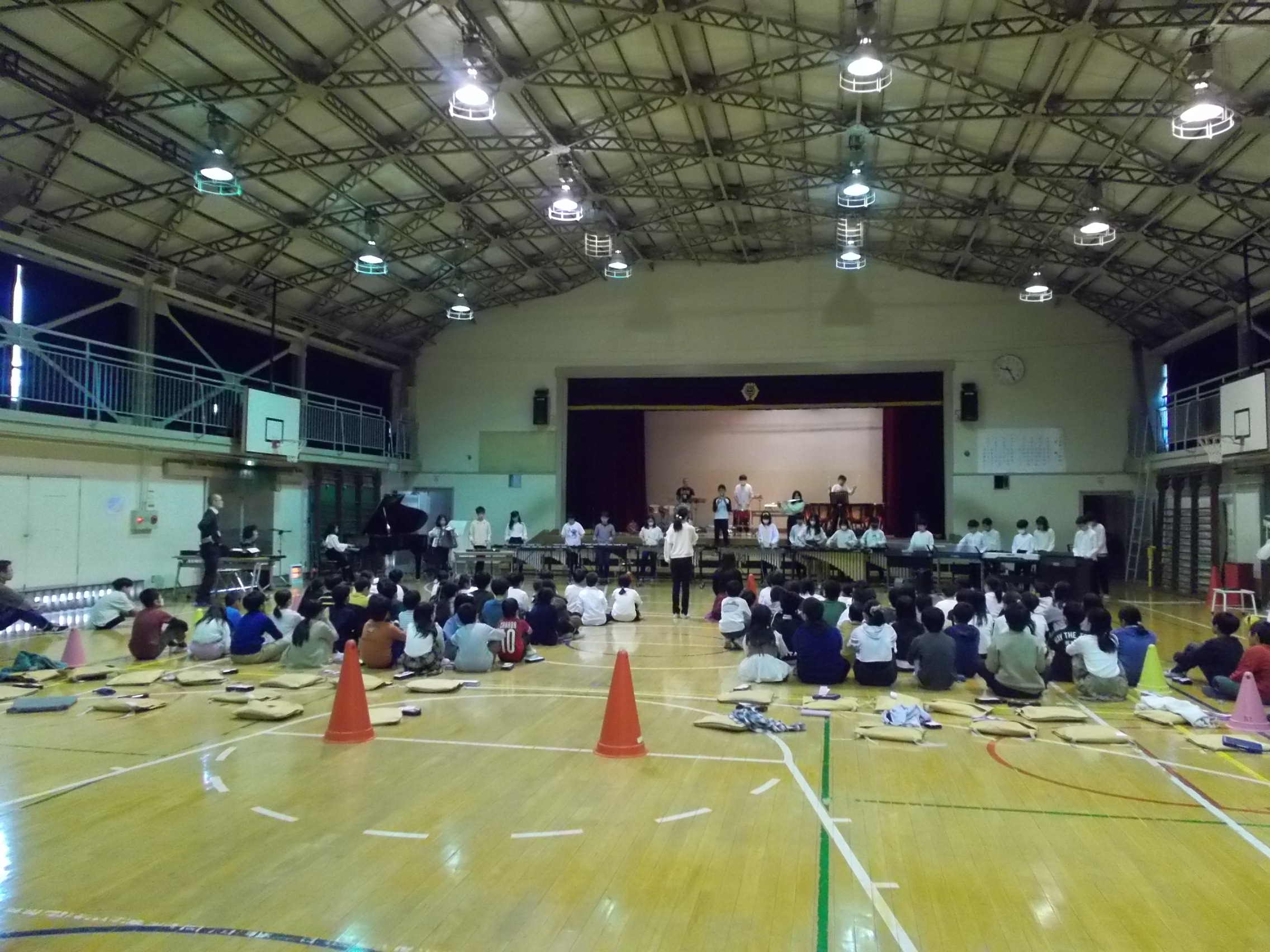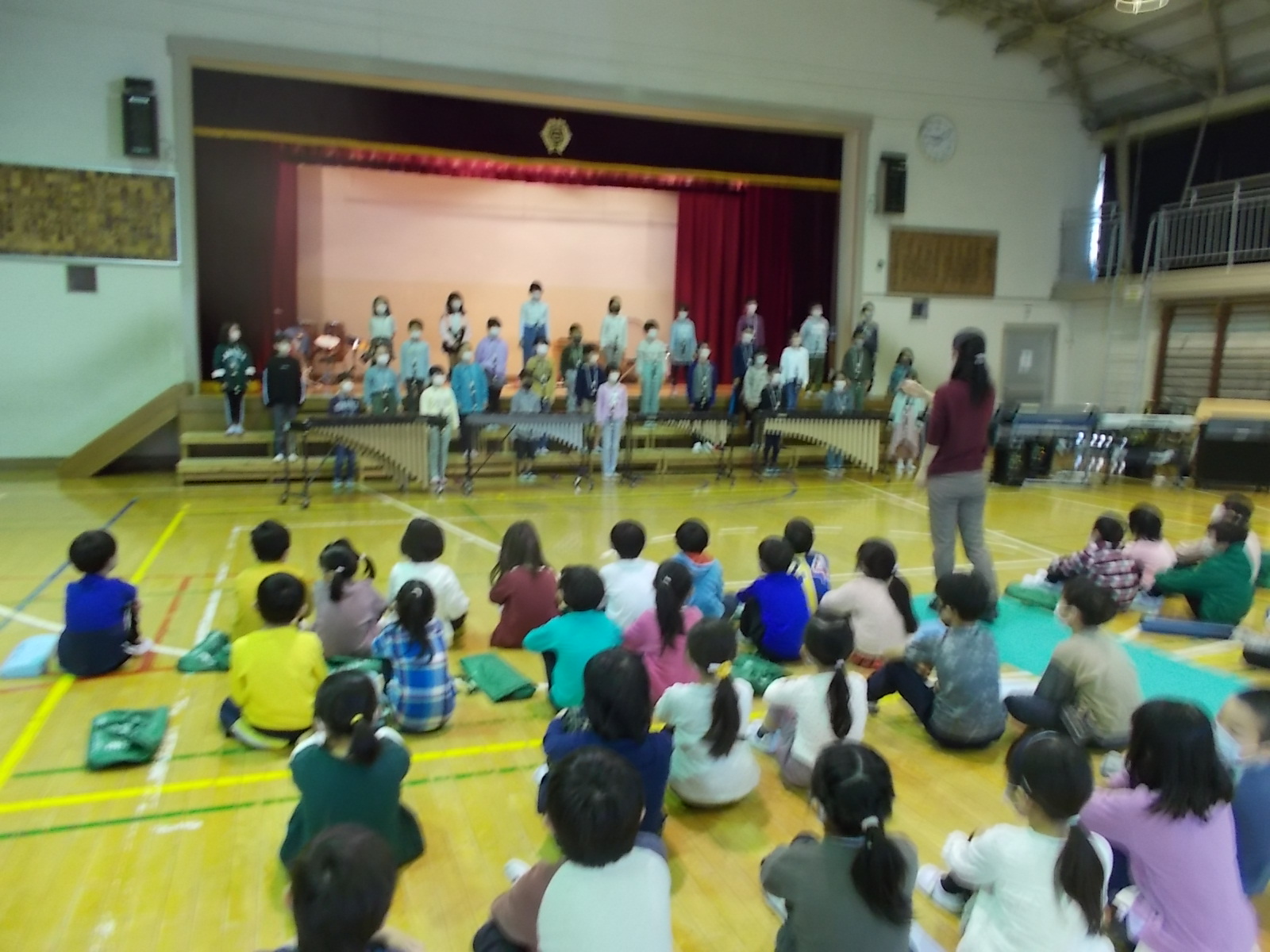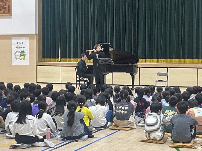 周年式典で6年生が演奏した「情熱大陸」に始まり、ジブリやディズニーなどなじみ深い曲からバッハの曲まで幅広く演奏していただきました。当日は上野さんがいらした当時の校長先生や4~6年生まで受け持った担任の先生もいらして、小学校当時の上野さんの話をしてくれました。子供たちはとても身近に感じたようです。どの子も真剣に聞き入っていました。