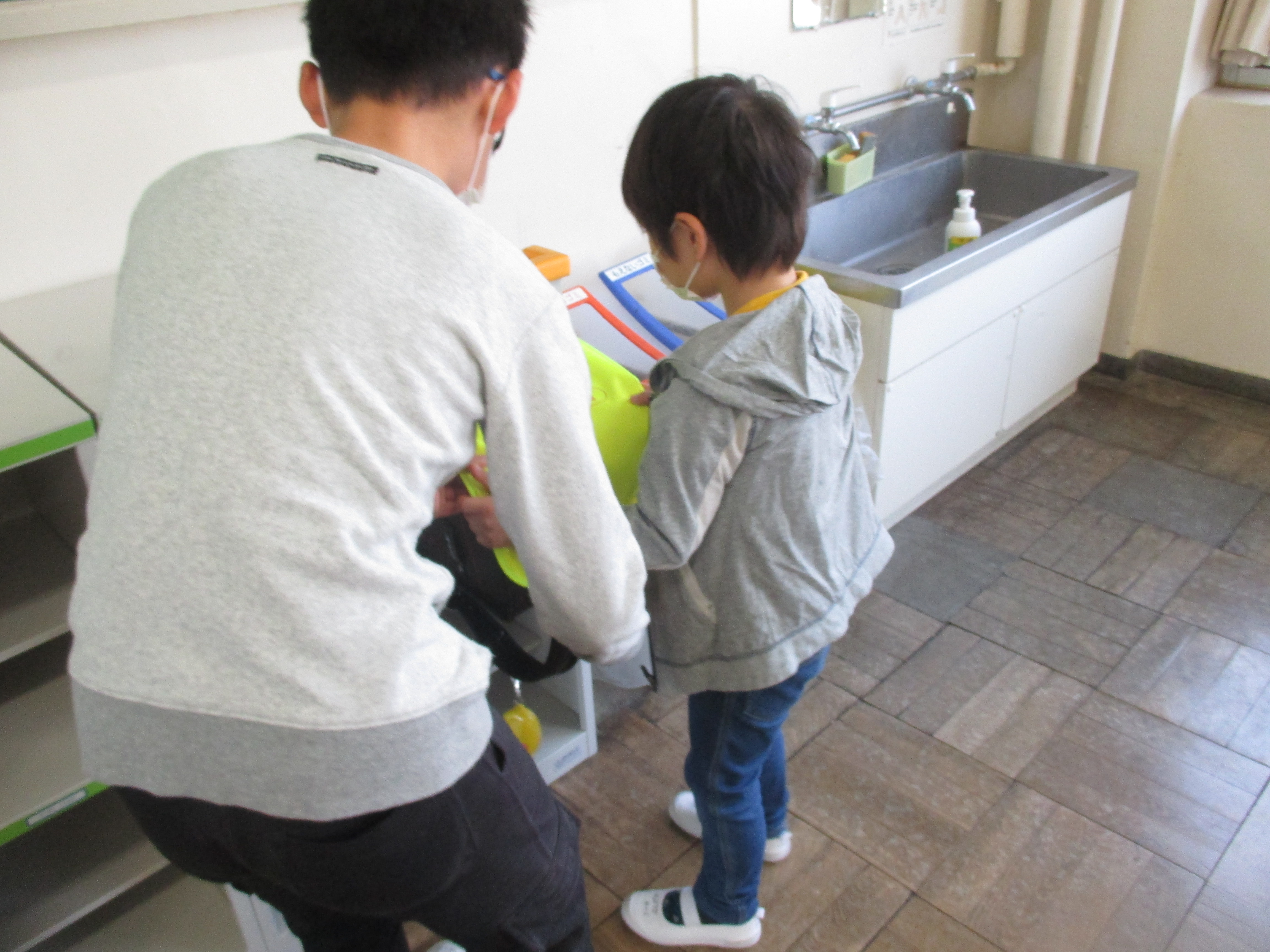 1年生が手本を見せながら年長さんにランドセルを背負わせてあげたり、毎日の健康観察を一緒にしてみたり、小学校の生活を体験してもらいました。来年度の1年生の入学を楽しみに待っている1年生は、線つなぎゲームや昔遊びで杉二小の楽しい生活を伝えました。