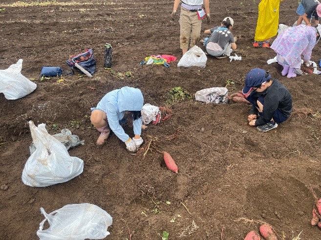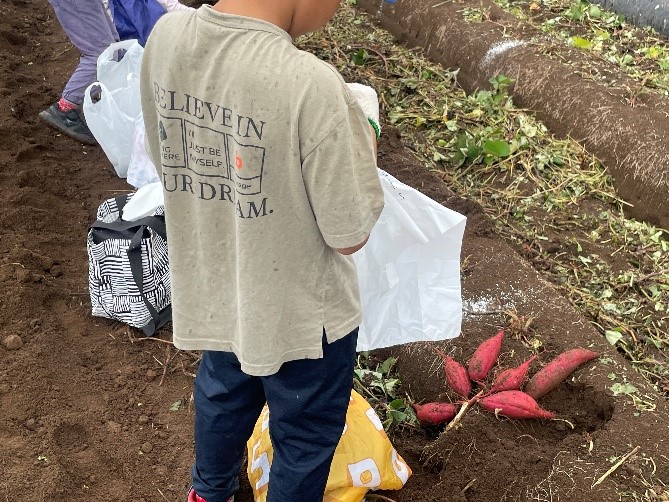小雨のため土が柔らかく、泥だらけになりながらも、大きなさつまいもを前にどの子もがんばりました。帰りは、袋いっぱいのさつまいもの入った袋を頑張って持ち帰りました。
