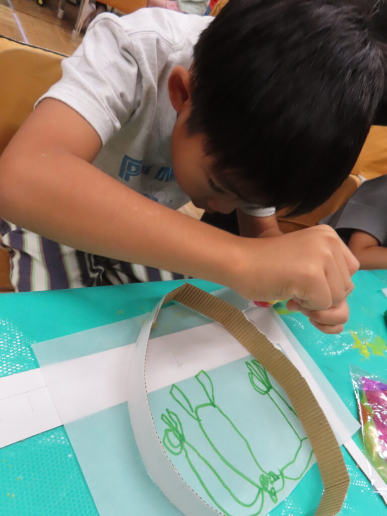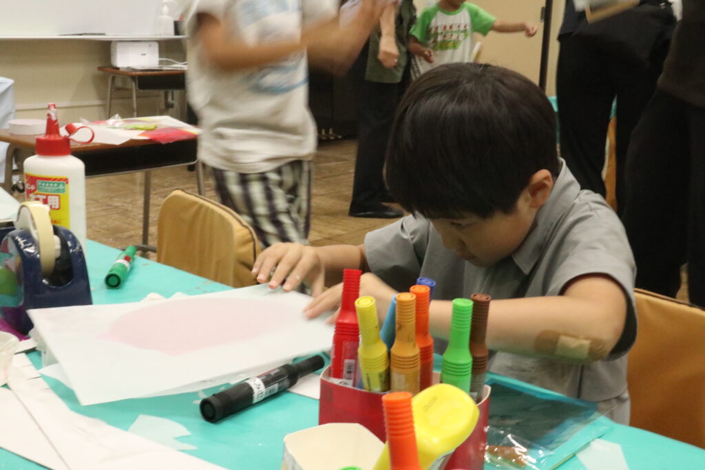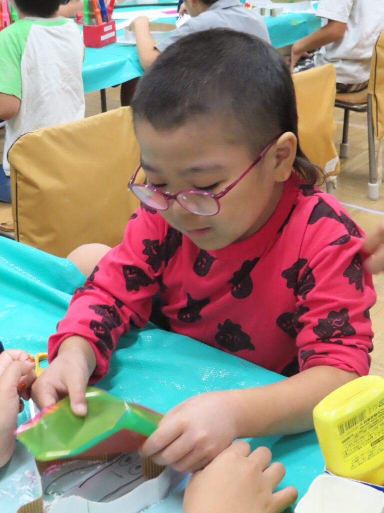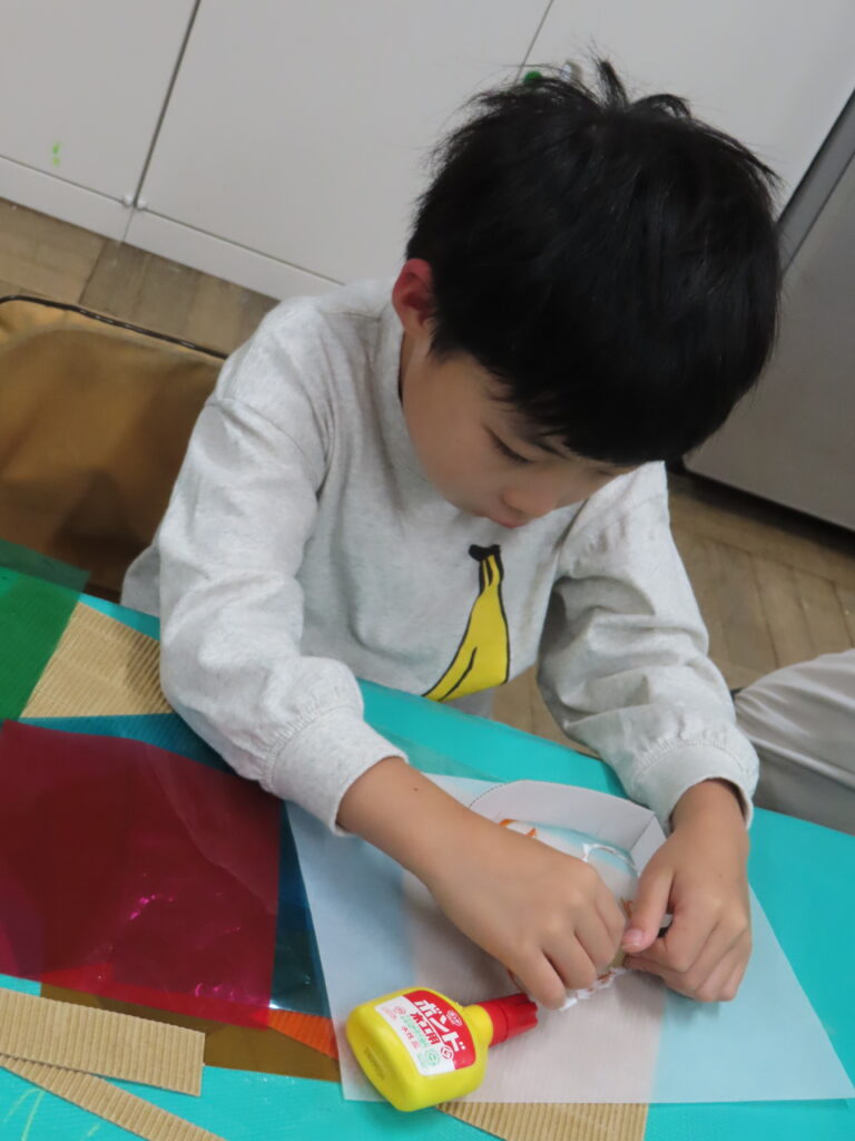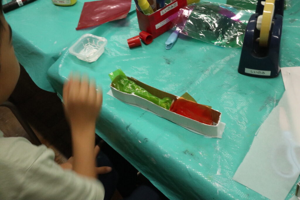 光に透かして見ると、きれいな色がふわっと浮かび上がります。カラーセロハンを重ねることで、色が混ざって新しい色が生まれる様子に、子どもたちは「色が変わった!」「きれい!」と驚きの声をあげていました。