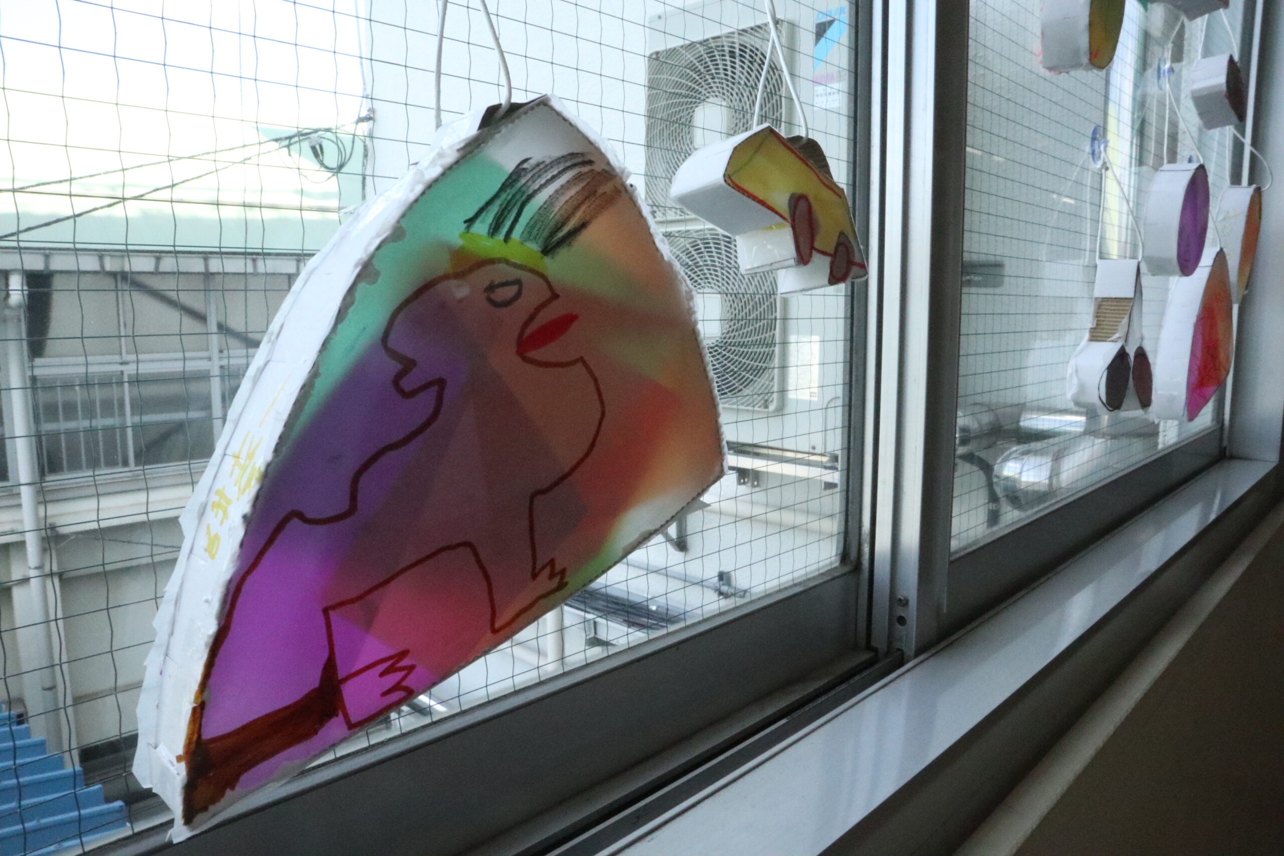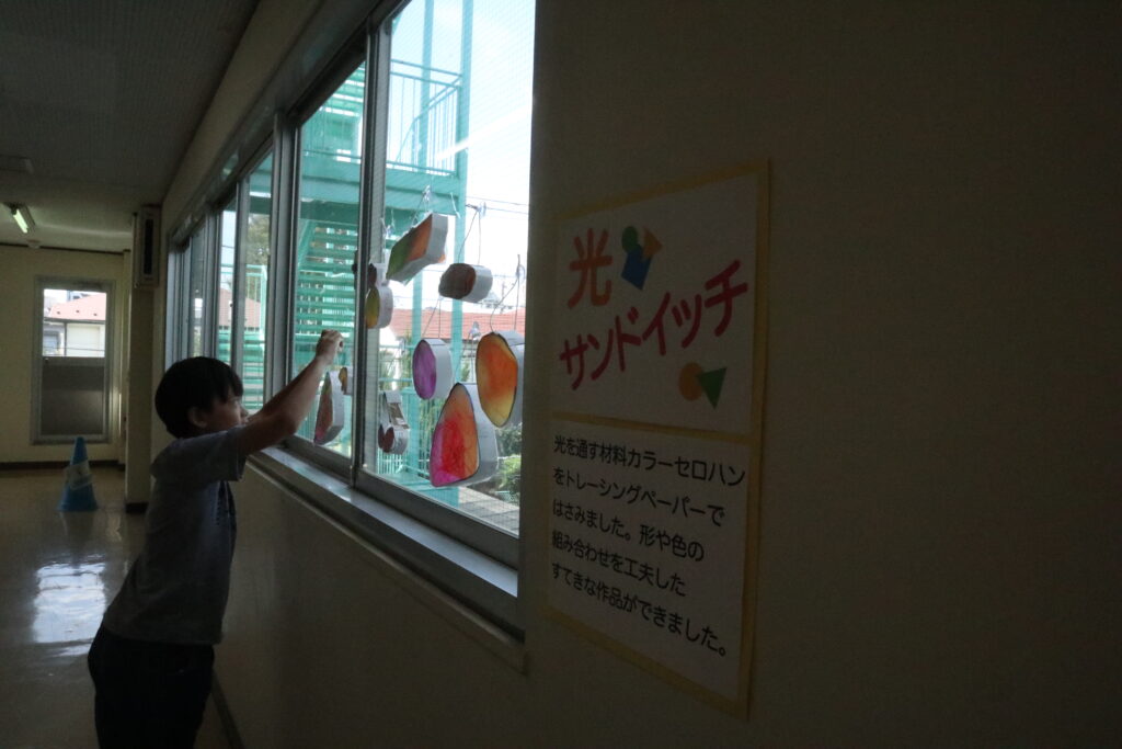 作品は、しいのみ学級3組前の廊下の窓に、吸盤で飾っています。光が透けて、廊下がぱっと華やかになりました。お立ち寄りの際は、ぜひご覧ください。子どもたちの工夫と感性が光る、素敵な作品が並んでいます。