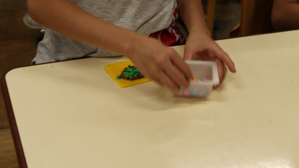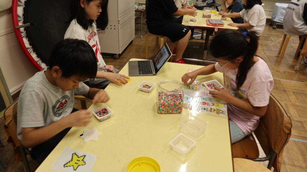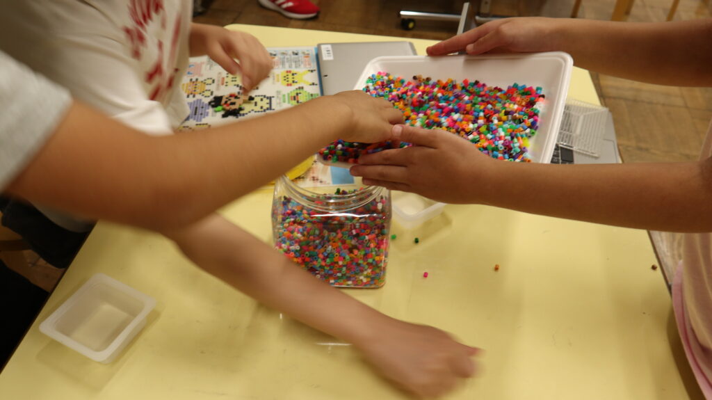 9月のクラブ活動では、しいのみ学級の生活単元学習でも取り組んでいる「アイロンビーズづくり」に挑戦しました。児童たちは、自分でつくりたい作品を考え、小さなビーズを指先でつまんで集中して並べていきます。