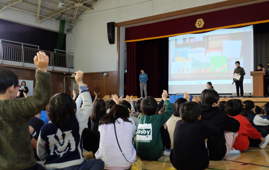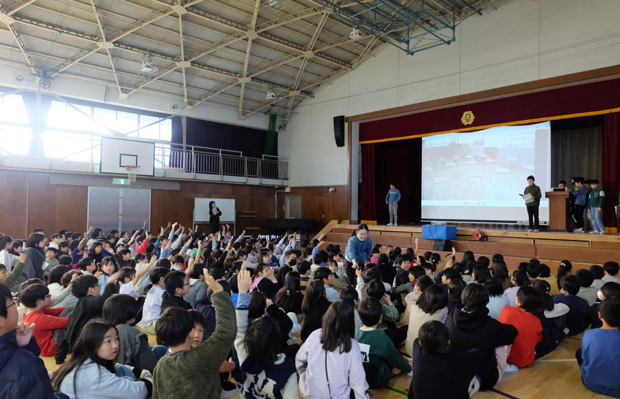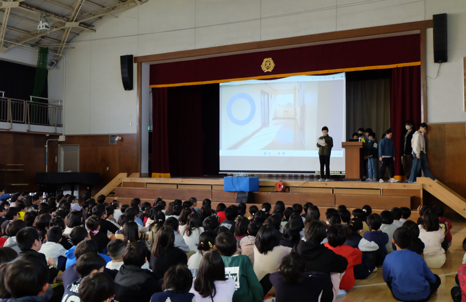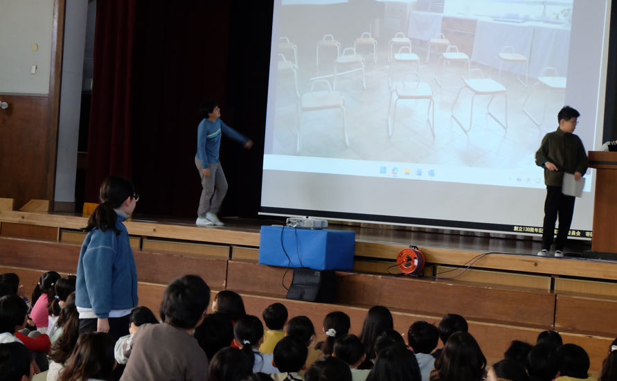 集会委員の5・6年生が企画した2学期最後の児童集会は、まちがい探し集会。学校の写真2枚を見比べ、どこが変わったのかを当てるクイズでした。ふだん何気なく使っている教室の写真に、実はたくさんの“まちがい”が…!子どもたちは写真をじっくりと見て答えを探し、どの学年も積極的に手を挙げてクイズに参加していました。難しい問題では、正解が出ると自然に拍手や歓声が起こり、会場は大盛り上がり。学年を超えてみんなで楽しむ、笑顔あふれる時間となりました。