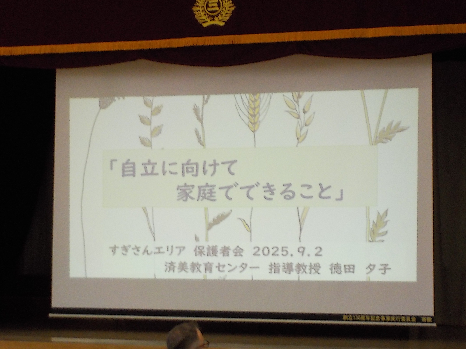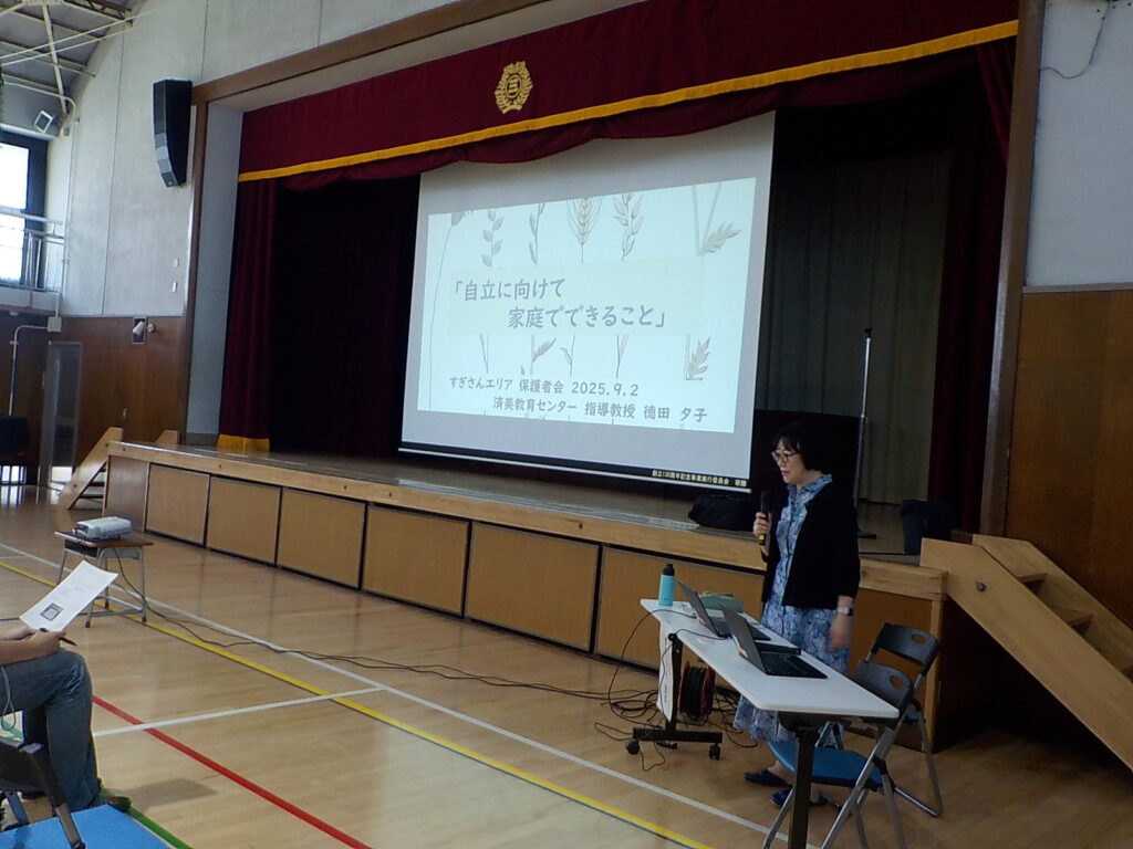 9月2日、体育館にて、4校合同の特別支援教室保護者会を行いました。済美教育センター指導教授の徳田 夕子先生をお招きし、「自立に向けて家庭でできること」についてお話をしていただきました。改めて、子どもの自立に向けて、学校と家庭が同じ方向を向いて育てていくことが重要であると感じました。