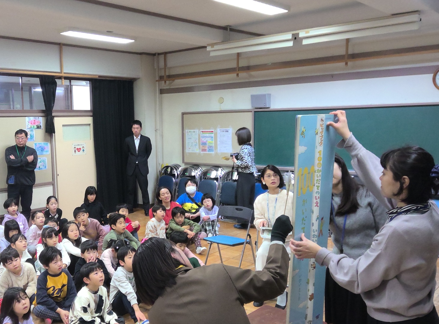 今回の読み聞かせスペシャルの題材は、人気の絵本『100かいだてのいえ』。通常サイズの絵本ではなく、大型絵本を使った迫力ある読み聞かせを楽しみました。さらにふだんの読み聞かせとはひと味違う「ペープサート」を使った読み聞かせでした。