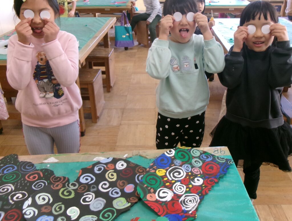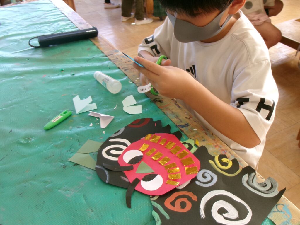 その中で、「この うず、ししまいの からだの もように にている」と、話し合いをきっかけに、自分たちが描いた渦と獅子舞の姿を結びつけて考える子が現れました。子どもたちは、そうした気づきを手がかりに、色画用紙を切ったり貼ったりしながら、渦の模様を生かした獅子舞の姿へと表現を広げていきました。