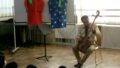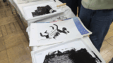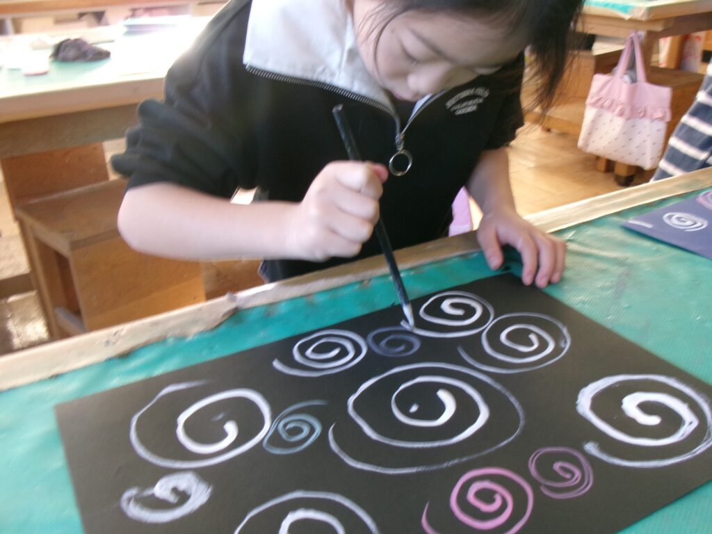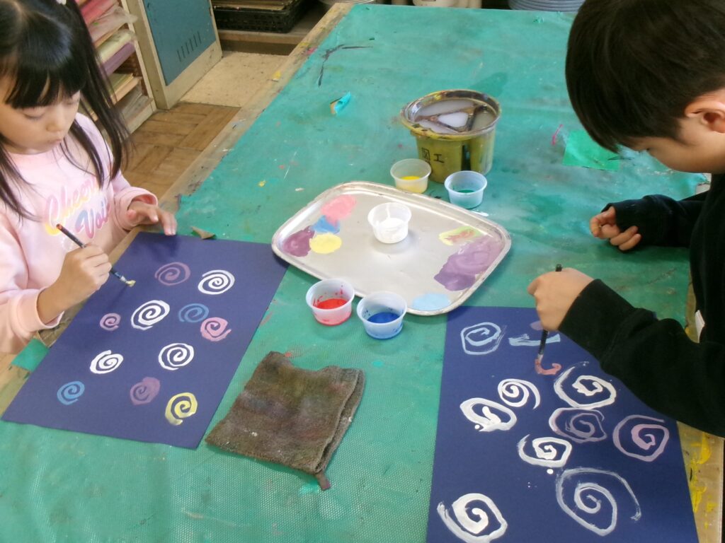 子どもたちは初めに濃い色の画用紙に、白をまぜた絵の具で、ぐるぐる、くねくねと線や色の動きを楽しみながら描きました。この時点では、まだ獅子舞になることは知らされておらず、思い思いに筆を動かしながら、線の重なりや色の見え方を味わっていました。
