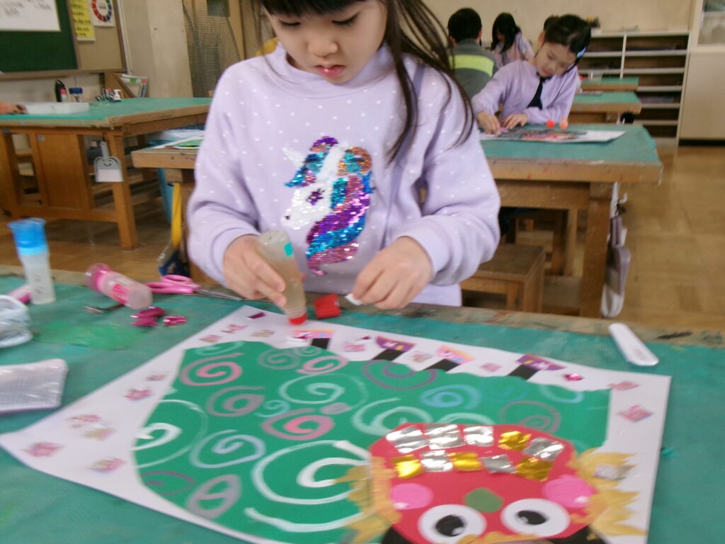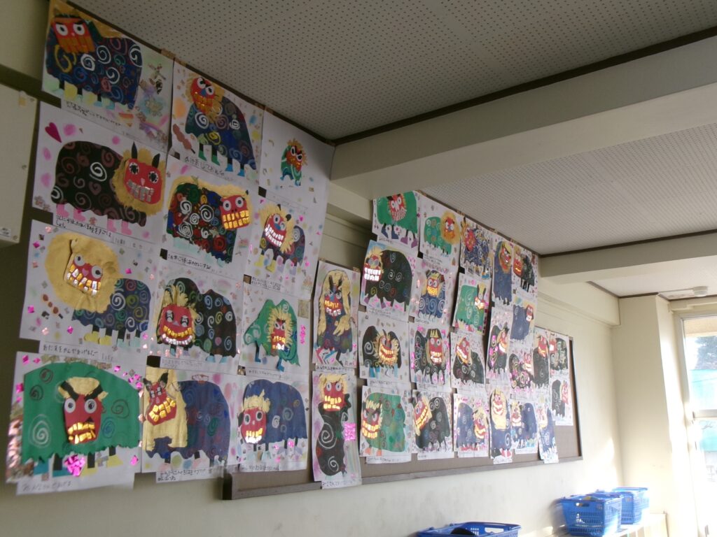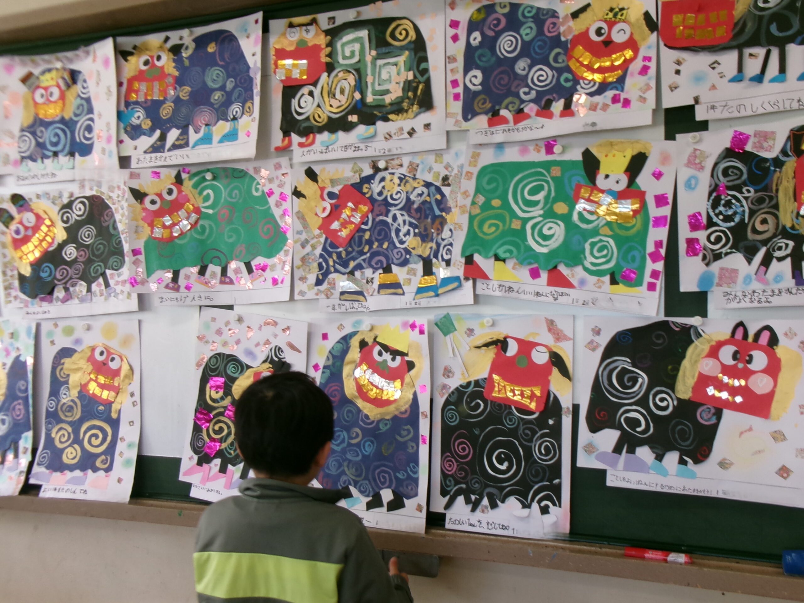 完成した作品は、新年を迎える校舎の玄関に展示しています。ぜひ、子どもたちの表現の広がりや、 図工の学びの過程を感じながらご覧ください。