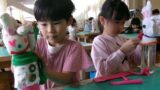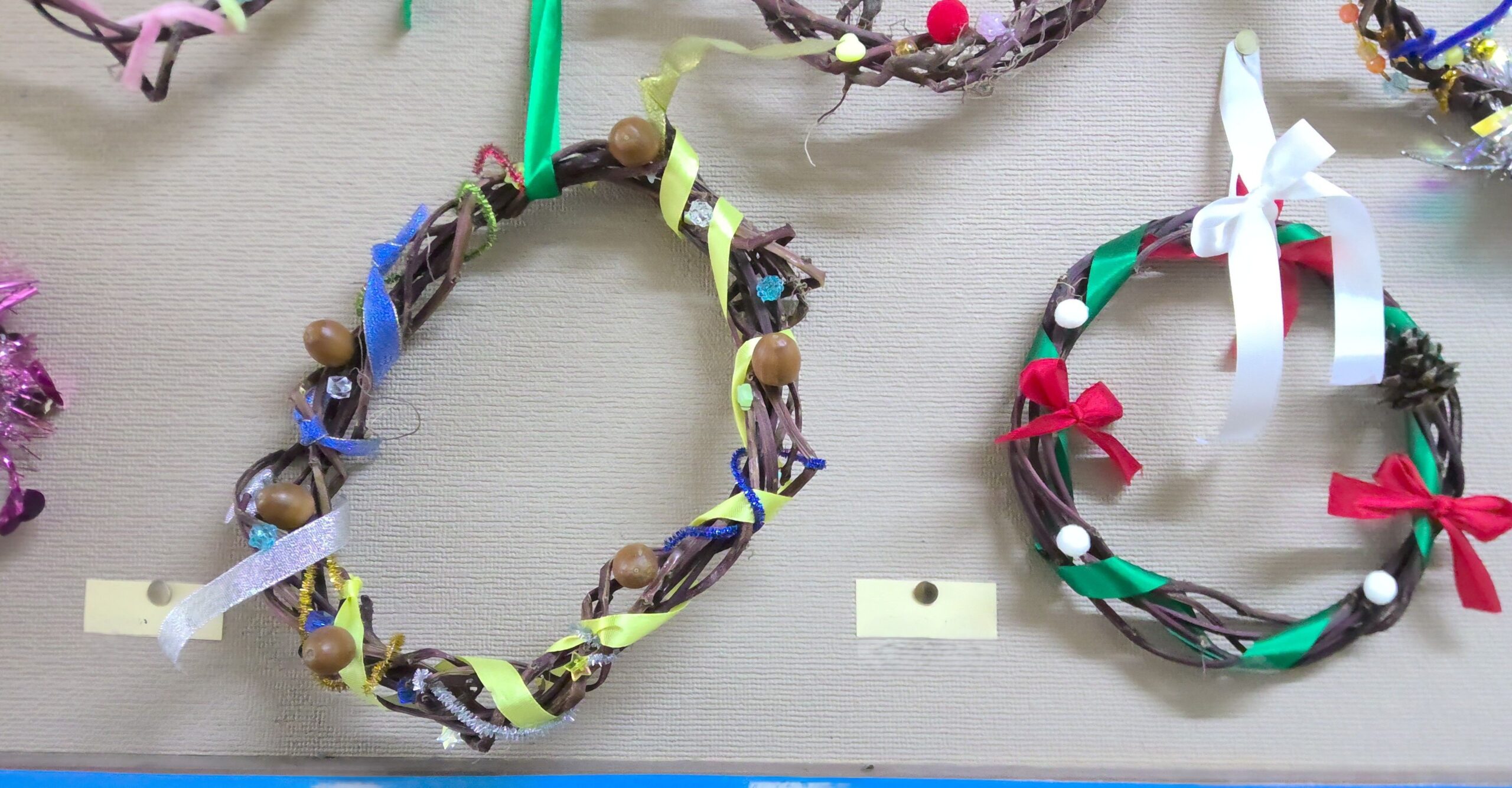 秋にサツマイモを掘った際に、学校支援本部のみなさんからサツマイモのつるもいただきました。1年生が自分たちで育てたアサガオのつると、サツマイモのつるを巻いて、リース作りをしました。生活科見学で拾ったドングリやマツボックリ、お気に入りのリボンやビーズなどで飾って、すてきなリースができました。1年生教室前の廊下に掲示してありますので、ぜひご覧ください。