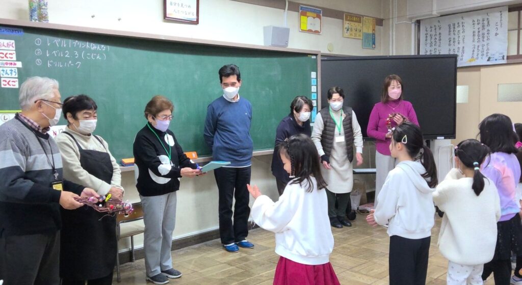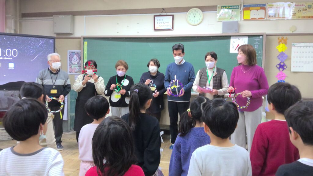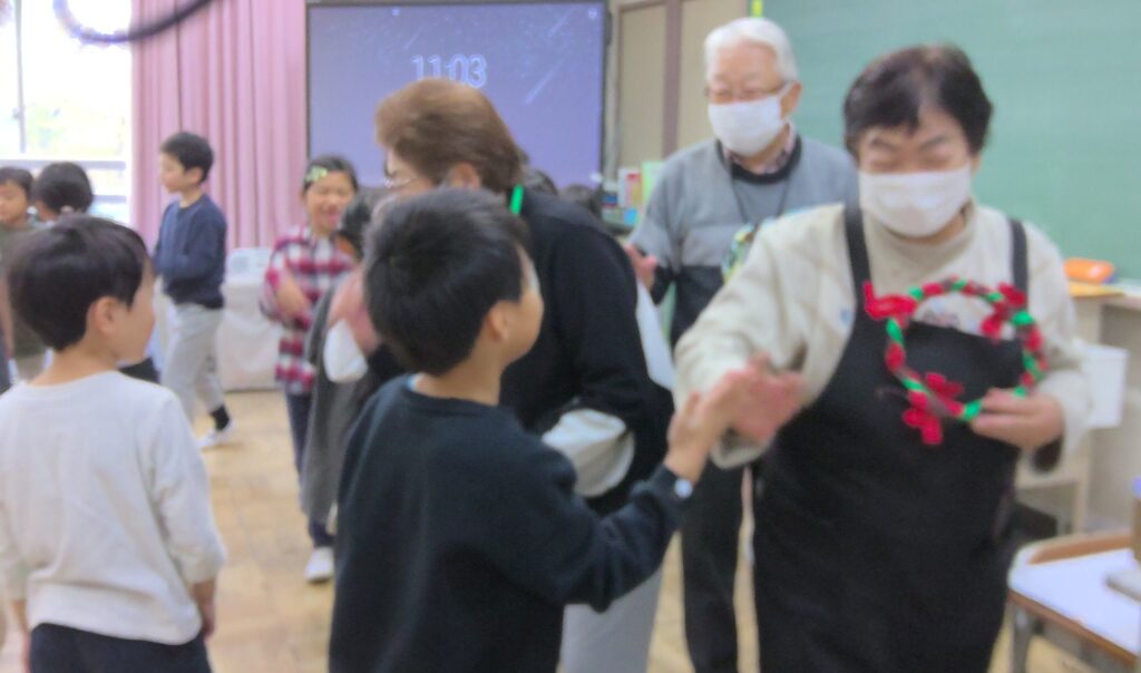 芋掘りの感想や、家でサツマイモを食べた時のエピソードなどをお礼の手紙にまとめ、リースと一緒に学校支援本部のみなさんにプレゼントしました。みなさんに喜んでいただき、子どもたちもとても嬉しそうでした。別れ際、自然に手を振ったりハイタッチをしたりし、笑顔で交流する姿が見られました。これからもこうした温かいつながりを大切にしていきたいなと思います。