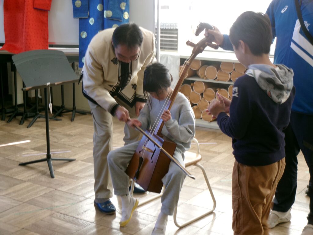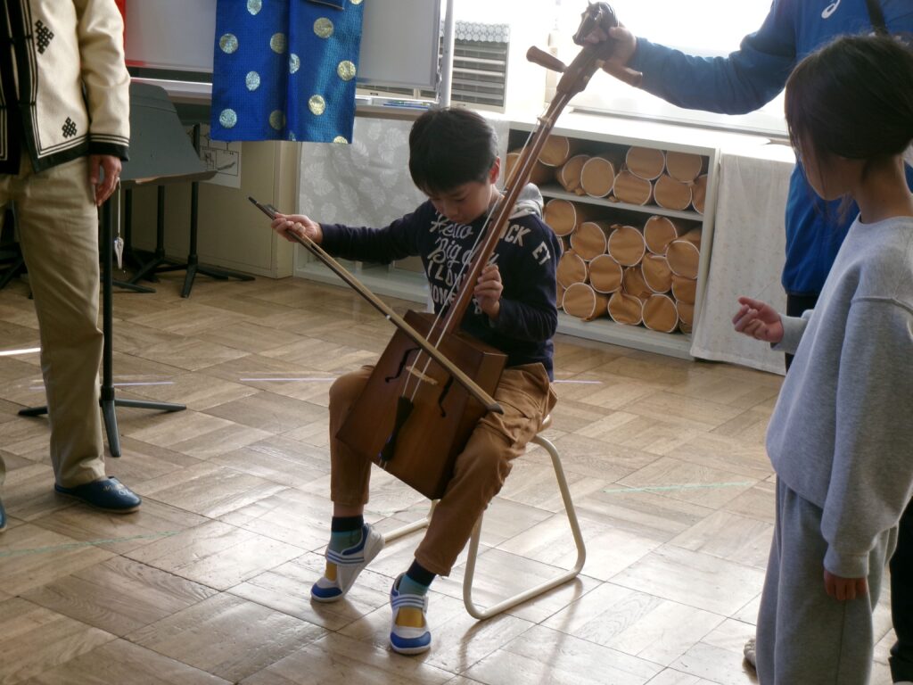 2年生は、これから「スーホの白い馬」を学習します。そこで本学習の前に、ゲストティーチャーを招いて馬頭琴の演奏を聴いたり、モンゴル国についてお話を聞いたりしました。また、子どもたちは、実際に馬頭琴を弾かせてもらったり、民族衣装を着させてもらったりもしました。物語の舞台となるモンゴル国の雰囲気を知ること、物語に登場する馬頭琴について体験したことをもとに、登場人物の心情に深く迫ることができるよう指導していきます。
