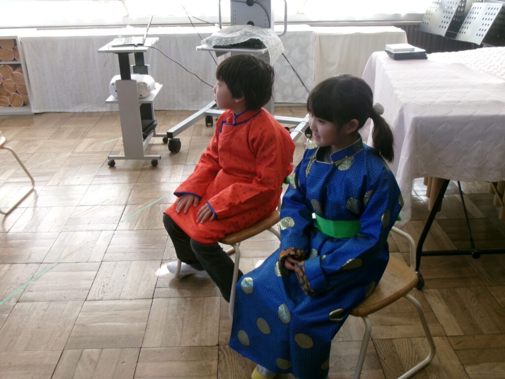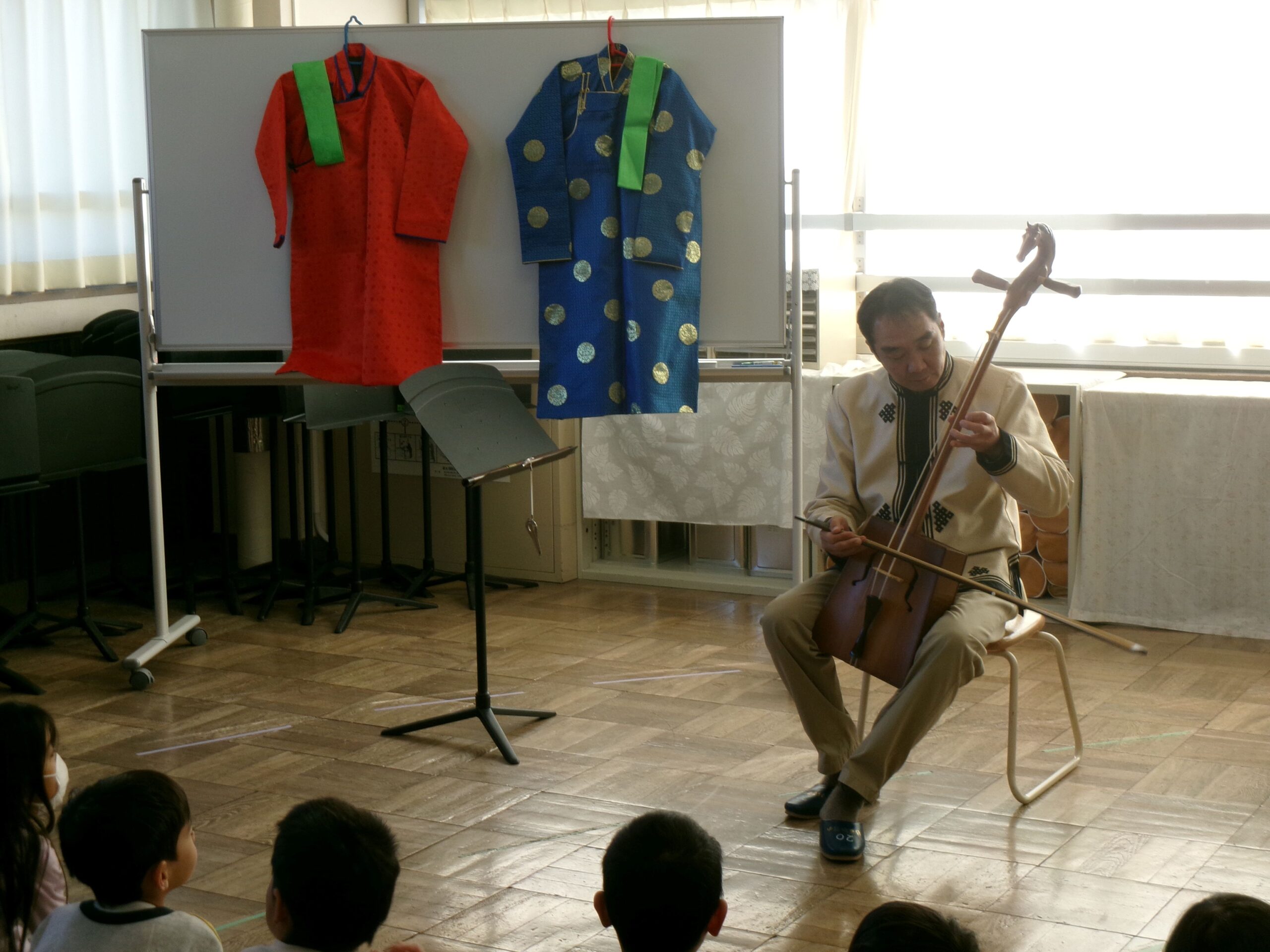 ブログ2年生は、これから「スーホの白い馬」を学習します。そこで本学習の前に、ゲストティーチャーを招いて馬頭琴の演奏を聴いたり、モンゴル国についてお話を聞いたりしました。また、子どもたちは、実際に馬頭琴を弾かせてもらったり、民族衣装を着させてもらったりもしました。物語の舞台となるモンゴル国の雰囲気を知ること、物語に登場する馬頭琴について体験したことをもとに、登場人物の心情に深く迫ることができるよう指導していきます。