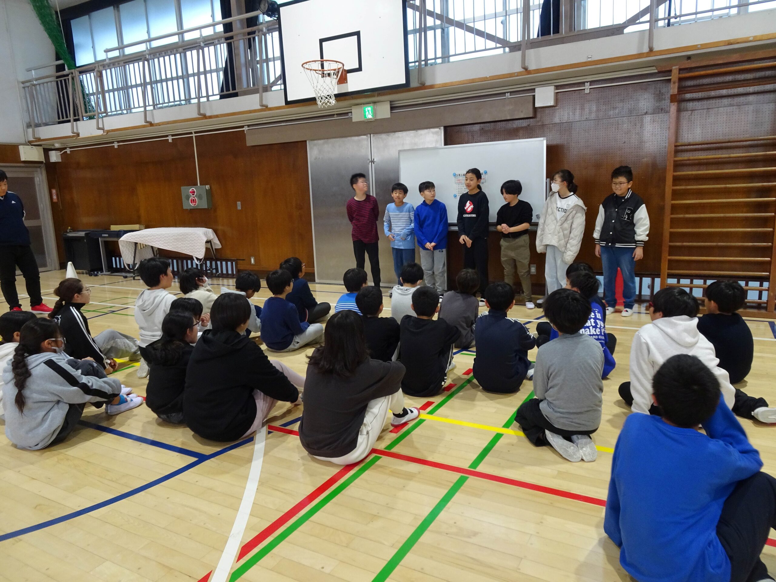 「6年生に向けて団結力を高めたい」「ふだんあまり関わらない友達ともっと仲良くなりたい」という子どもたちの思いから、『5年1組仲良くなろう会』を企画しました。学級会では、「団結力」や「もっと仲良く」をキーワードに、遊びやルールの工夫について話し合いました。当日は、司会グループを中心に、子どもたち自身で会を運営しました。