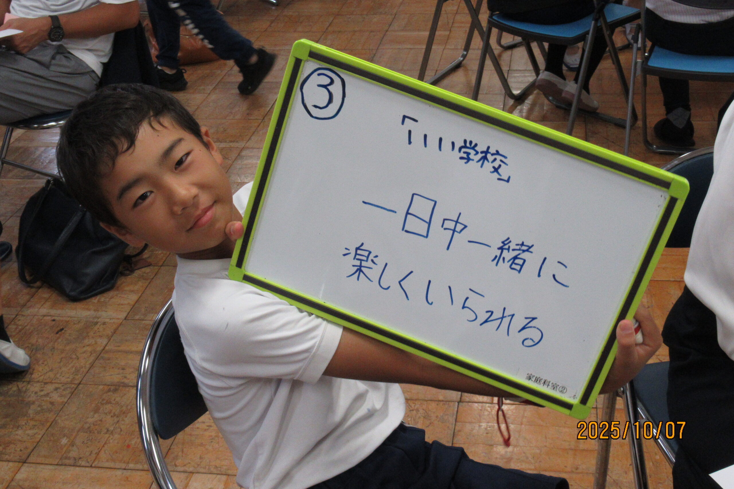 子どもたちは、自分たちの思いや考えを伝えるだけでなく、地域の方々の声にも耳を傾けながら、「いい学校」について真剣に話し合いました。子どもたちからは、「先生も子どもも基本的なことを守る学校」「中身も外身もある学校」「一日中一緒に楽しくいられる学校」「みんなが仲がよくて楽しく思いやりがある学校」「何でも言い合える 協力 仲良し 楽しい 人に話せる学校」「みんなが仲良く協力し合える学校」という考えが発表されました。
